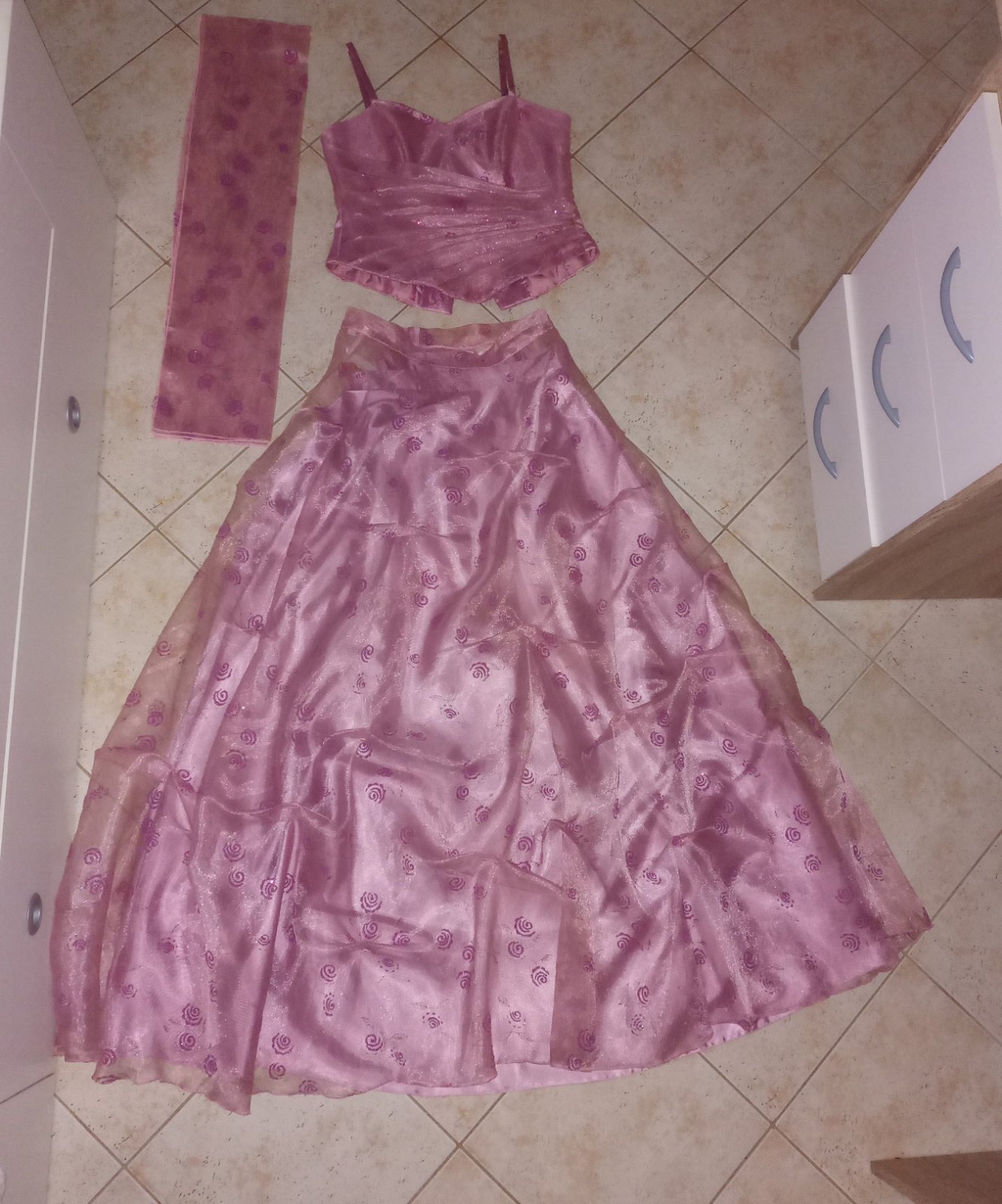 Oblečené 1x pár hodín. Vyčistené. Vzadu dierka, treba zašit. Vzadu zavinovanie stuhou ( stuhu neviem nájst 🫣) zohladnené v cene celkova dlzka merané vzadu 150cm.