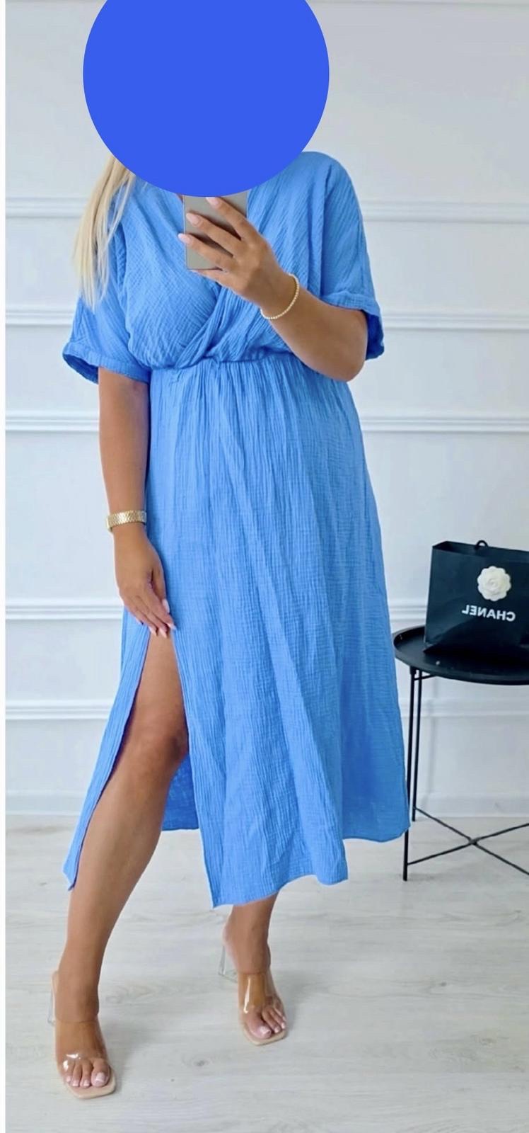 Krasne modre saty, mušelinova latka. Velkost UNI vhodna pre S, M, L, XL. Farba krasna baby-blue, ako na poslednej foto.