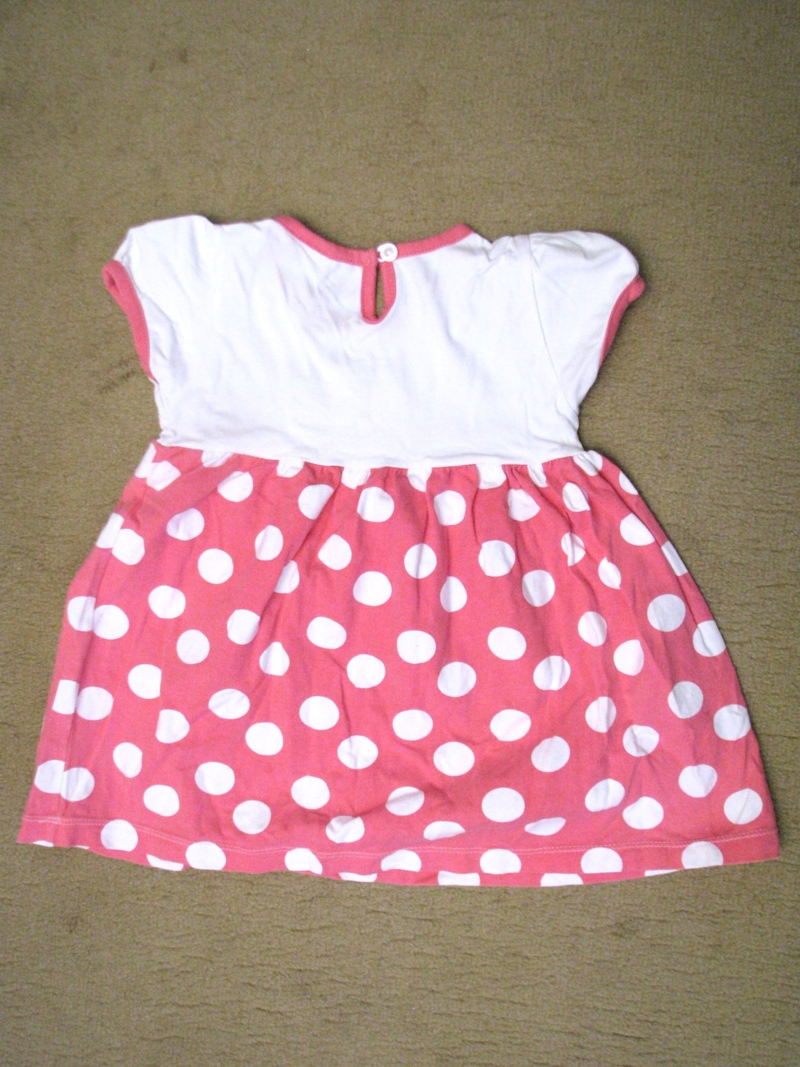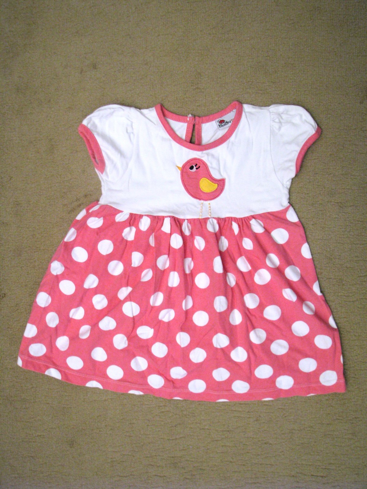 Pekné bavlnené letné dievčenské šaty s bielymi bodkami na ružovom podklade a s milou aplikáciou vtáčika. Pekne zachovalé, bez poškodení. Veľkosť 92 - 98, na 2 - 3 roky. V prípade záujmu premeriam.
