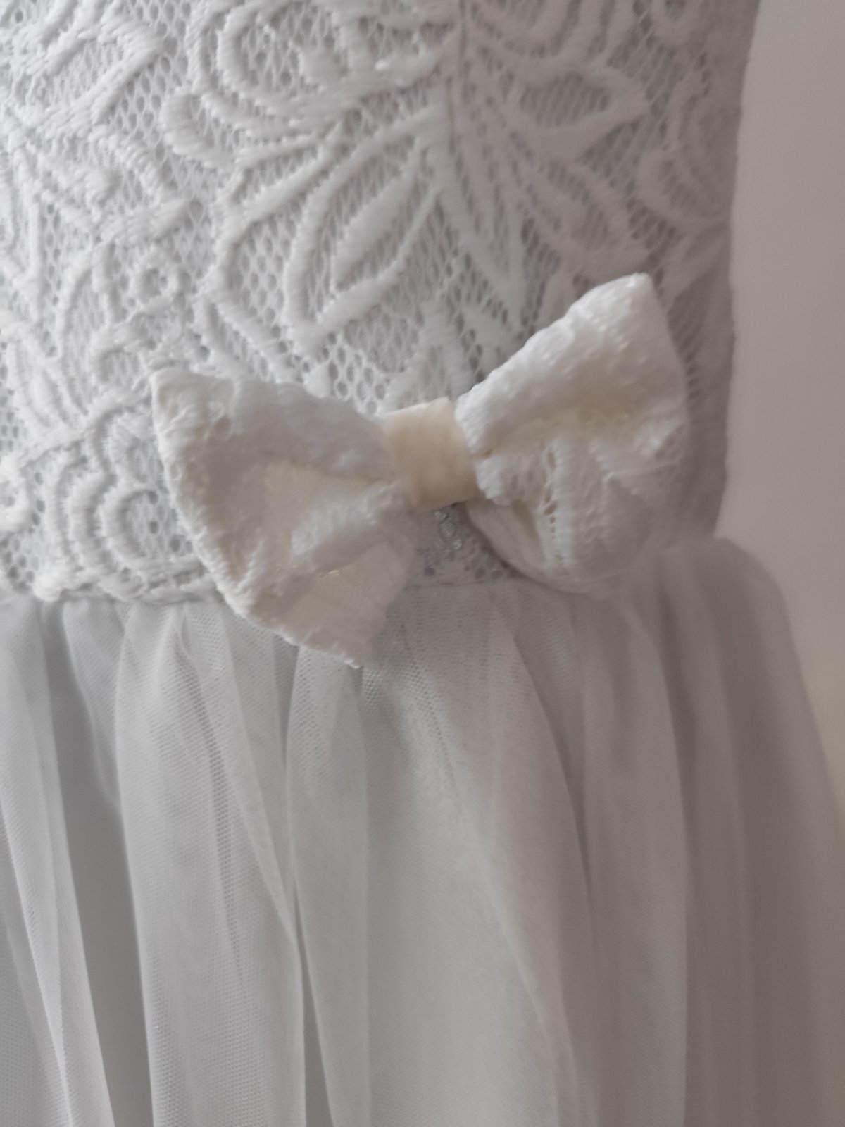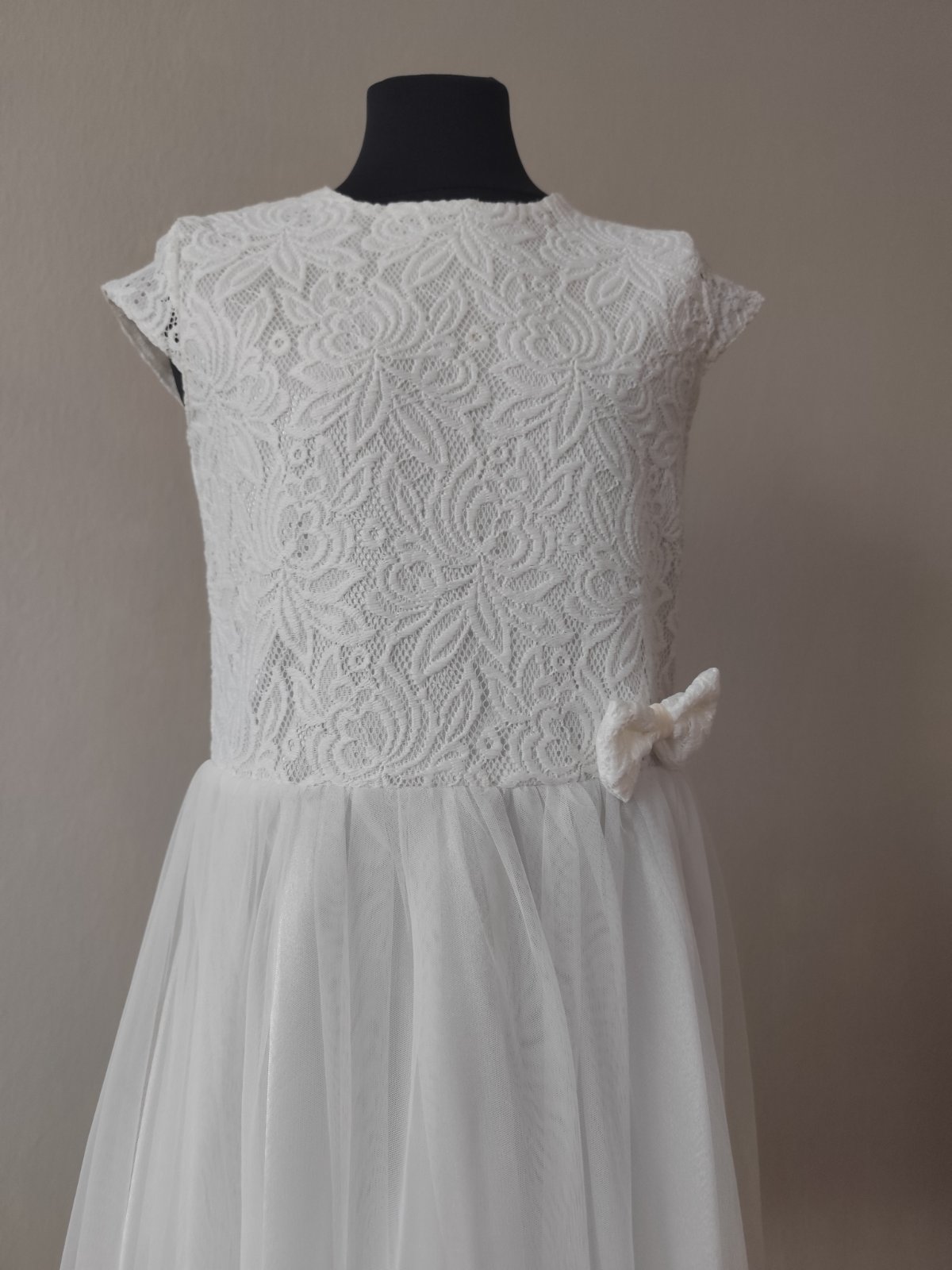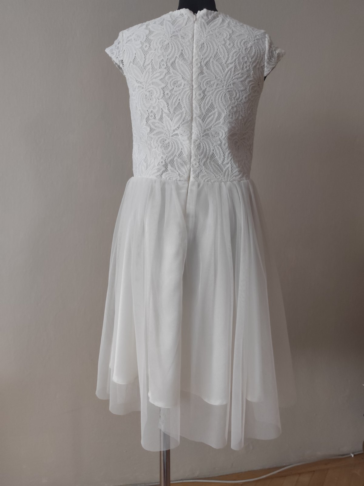 Predám krásne smotanové šatky. Nie sú biele. Majú krásny čipkovaný živôtik, ktorý je podšitý. Jemnučká, príjemna čipka. Z nej sú aj krátke rukávky na pleciach. Suknička je tylová, podšitá saténovou podšívkou. Dlžka šiat je midi, no záleží aj od výšky dievčatka. V páse sú ozdobené peknou mašličkou. Rozopínaju sa na zips, ktorý sa sťahuje dostatocne hlboko na pohodlné obliekanie. Su lahke, prijemne na telo.
