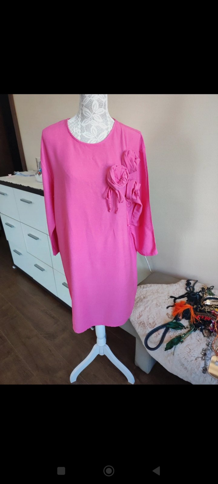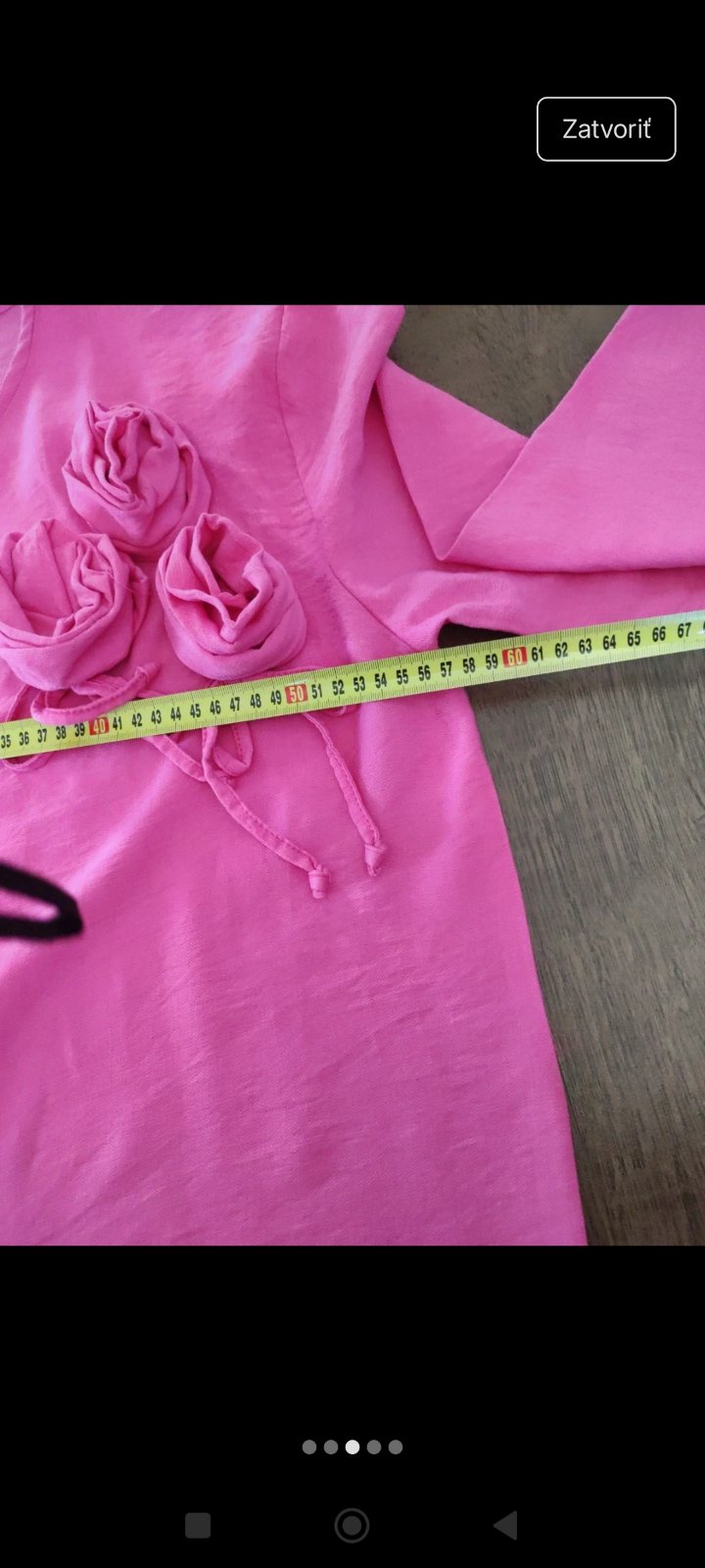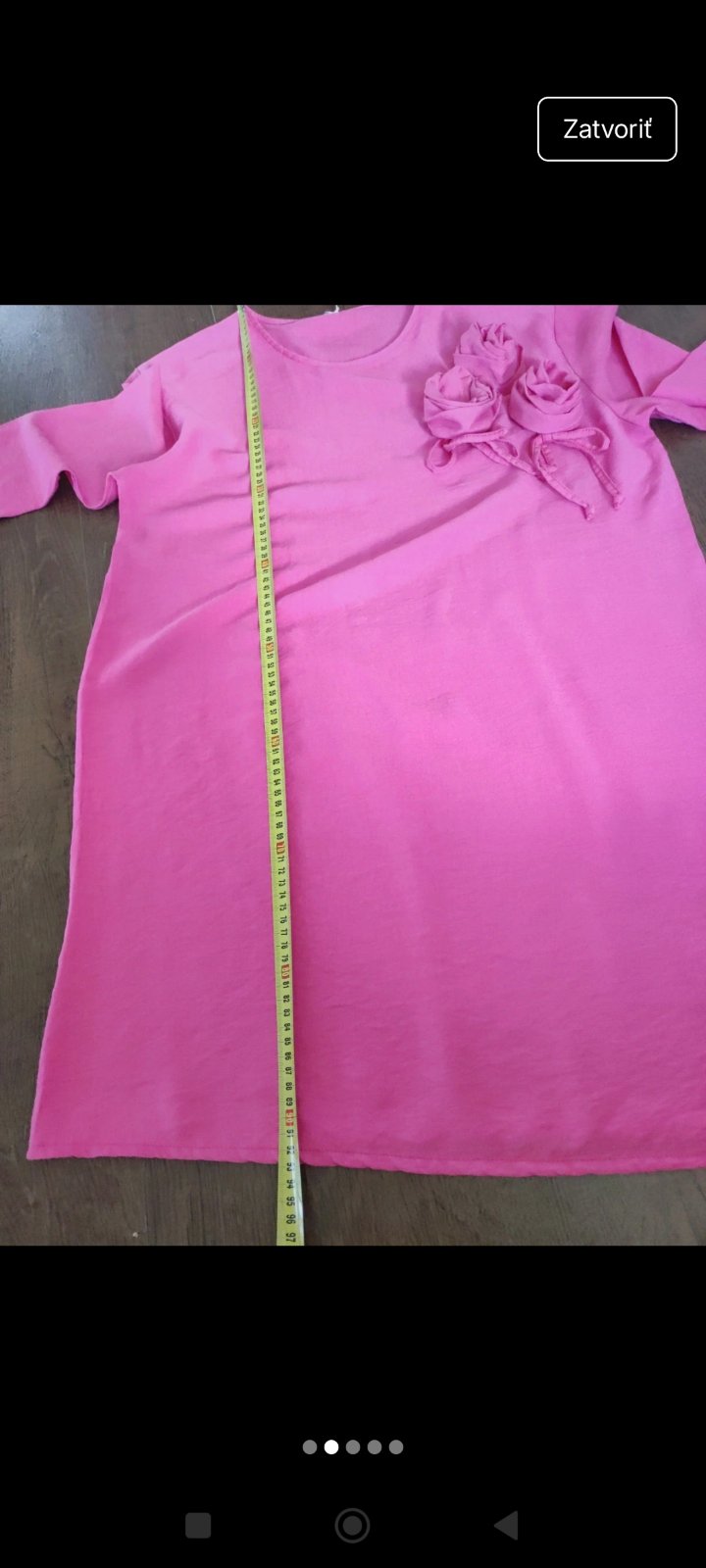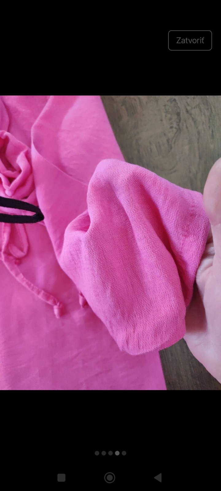 Ľahké, voľné košeľové šaty, výstrih V, dlhý rukáv s manžetou a gombíkmi, možu sa vyhrnúť. Farba jemnejšia ružová ako na foto. Ukončenie do oblúka s rozparkami. Vhodné na voľný čas, dovolenku aj do...