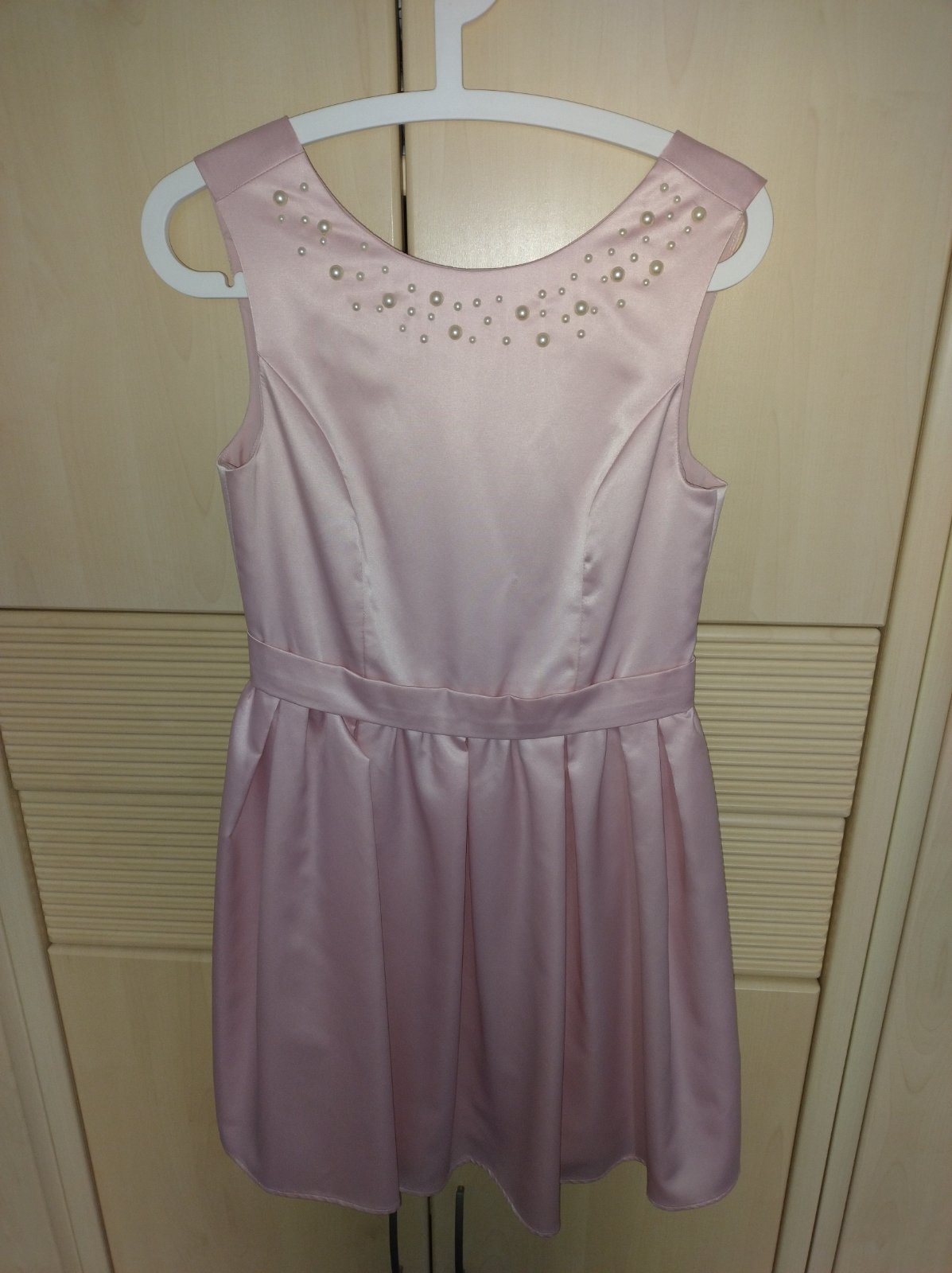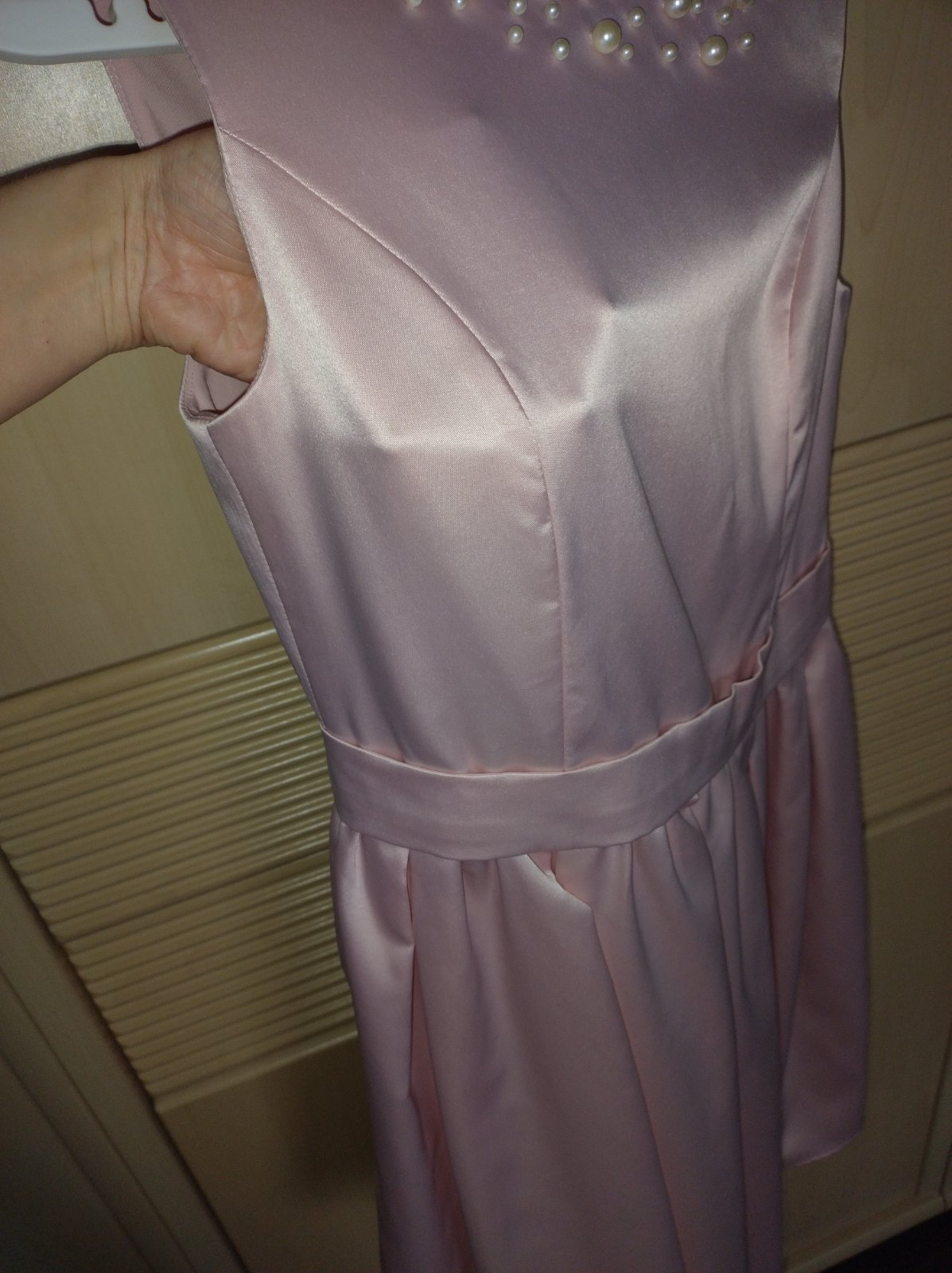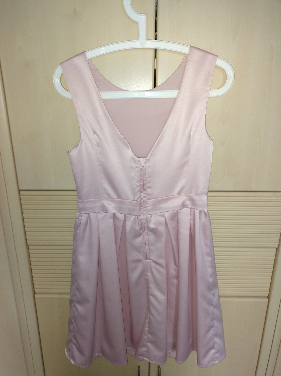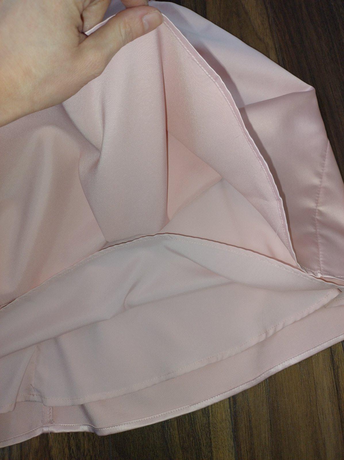 Letné spoločenské šaty, veľkostne S. Sú z New Yorkera, ale štítky som odpárala. Lesklý vzhľad, nie sú pružné, zvýraznený pás, volánová podšitá sukňa. Oblečené raz na letnej svadbe. Bez poškodení.