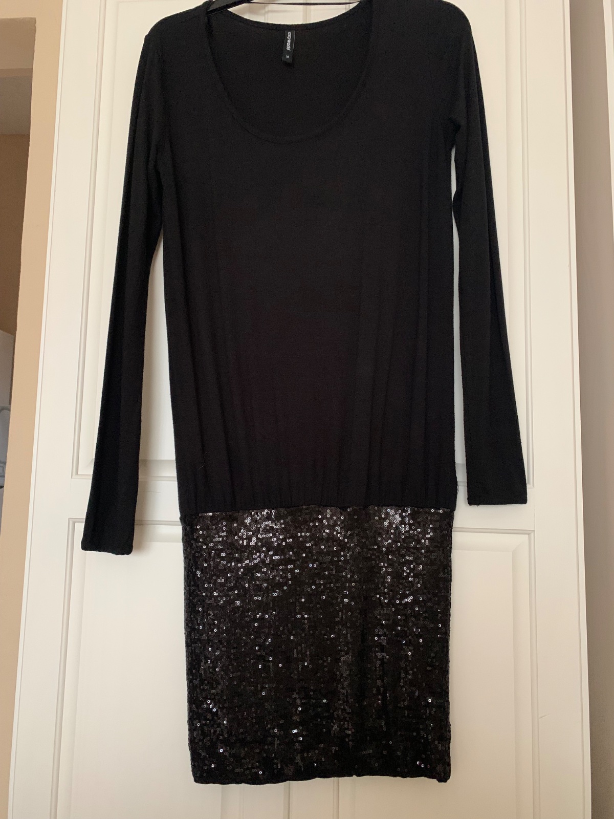 Saty z prijemne upletu aj pod flitrami. Velmi dobre zakryvajuce brucho, sukna sa vytiahne nad kolena a zvrsok sa nariasi na bruchu, cize ho zakryje. Dlzka v klude 105,, boky 100, prsia 80-110cm, rukav od presitia 70 cm.
