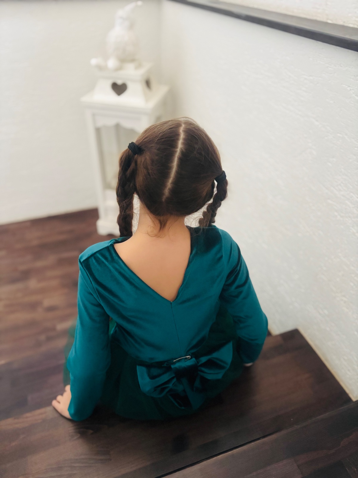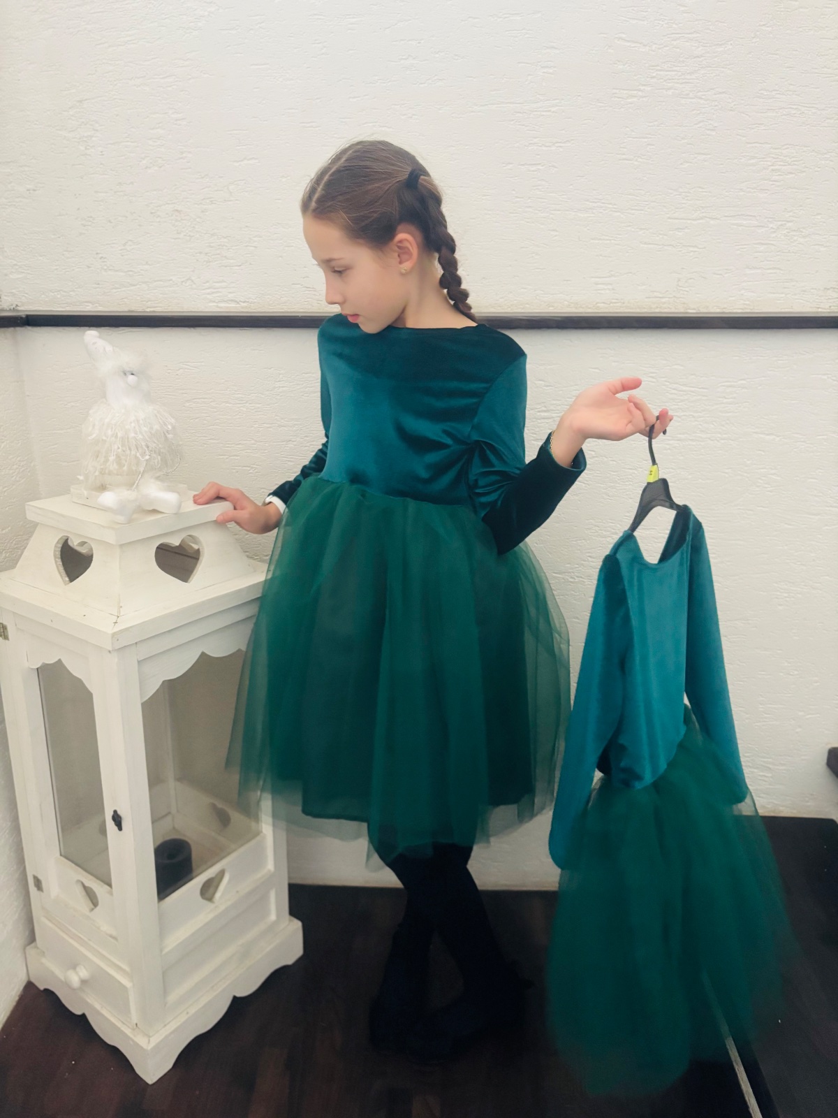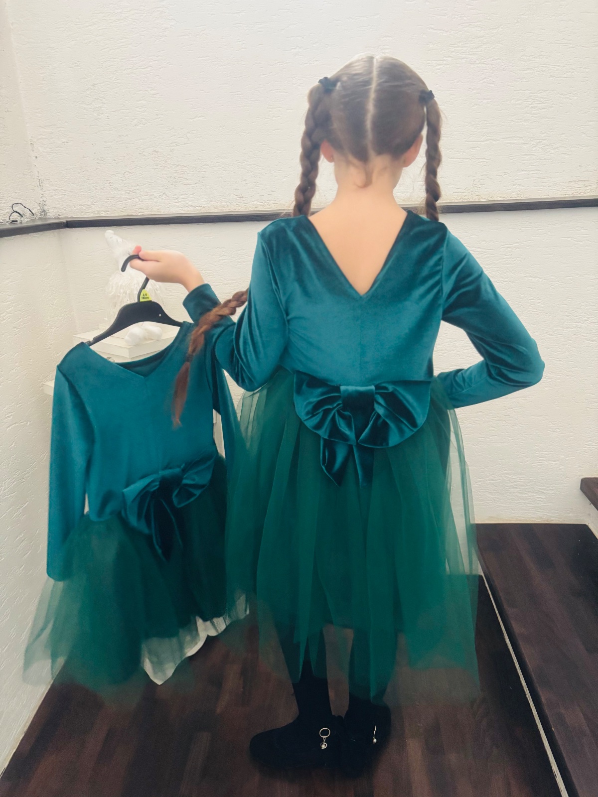 Vrchný diel je z nádherného zamatového úpletu s dlhým rukávom a vzadu má jemný véčkový výstrih 💫. Na chrbátiku zdobí šaty krásna veľká mašľa, ktorá im dodáva sviatočný šmrnc 🎀.