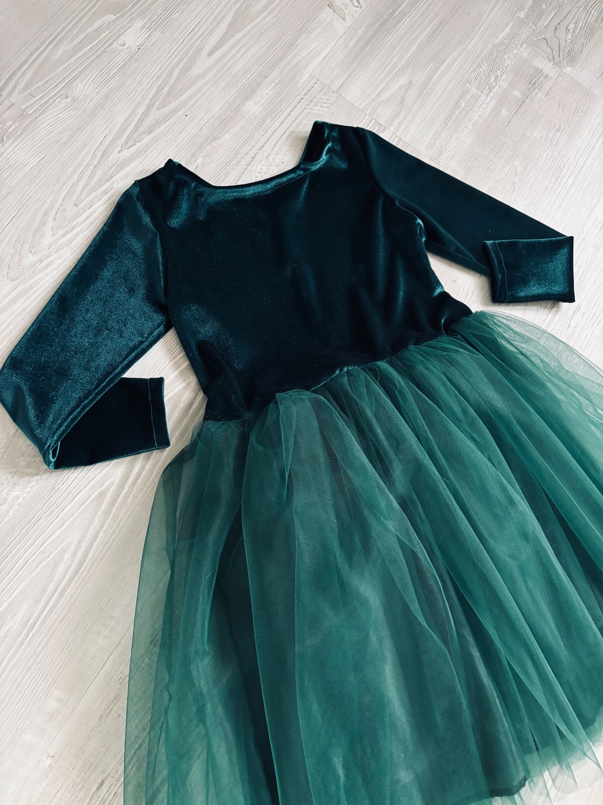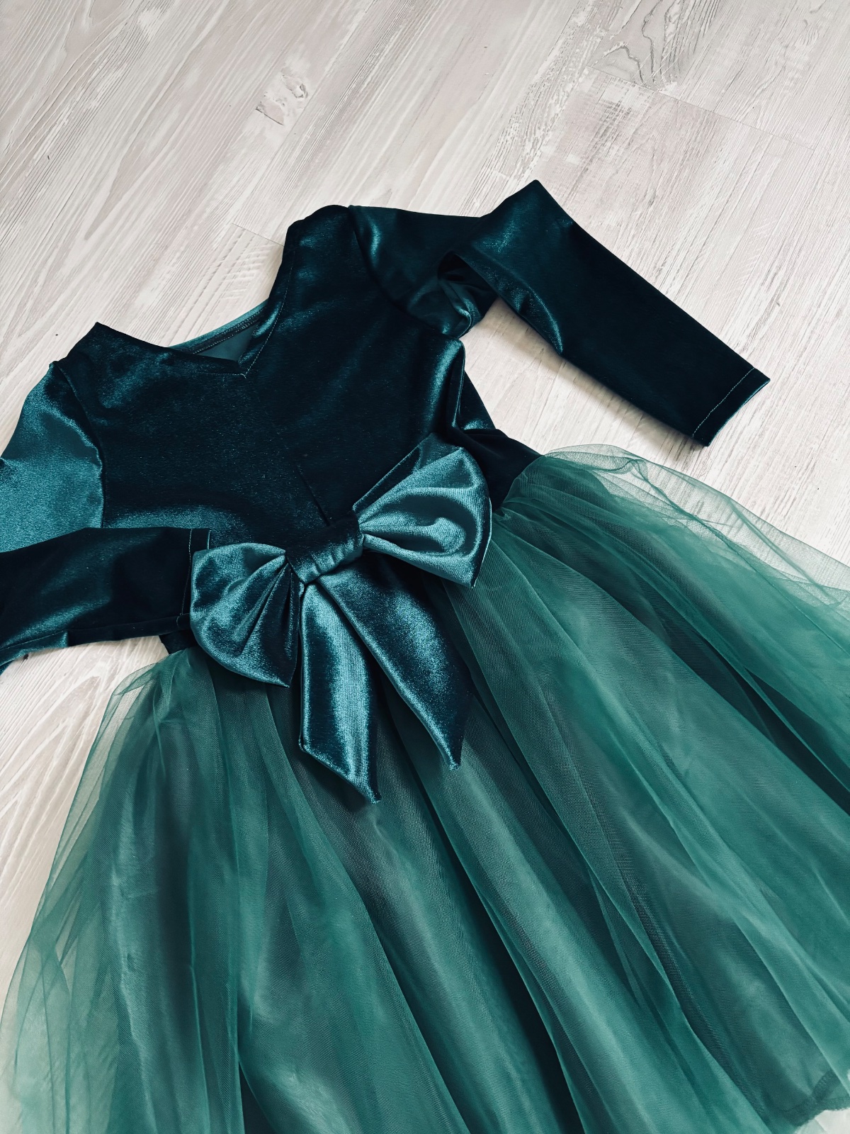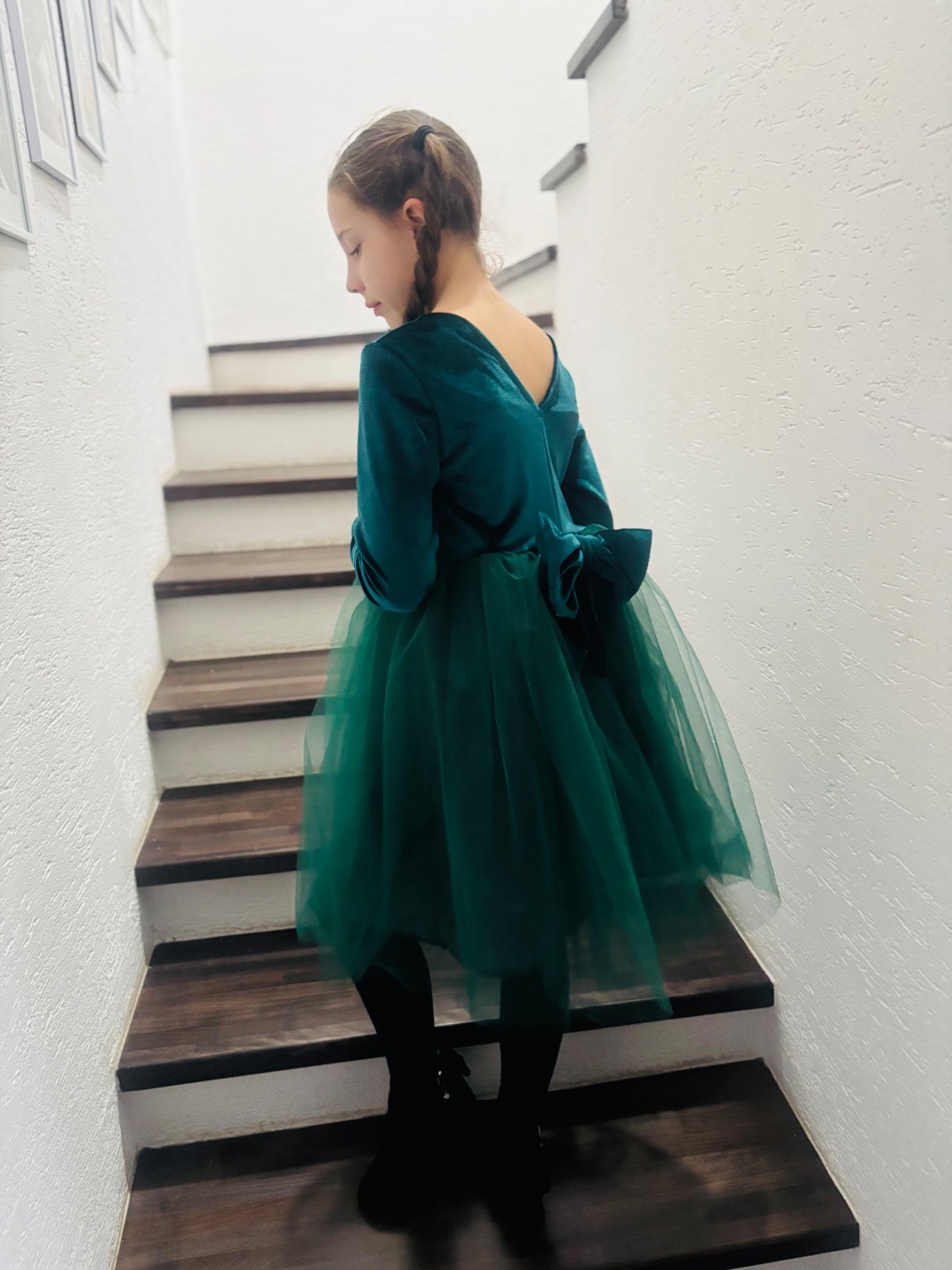 Vrchný diel je z nádherného zamatového úpletu s dlhým rukávom a vzadu má jemný véčkový výstrih 💫. Na chrbátiku zdobí šaty krásna veľká mašľa, ktorá im dodáva sviatočný šmrnc 🎀.