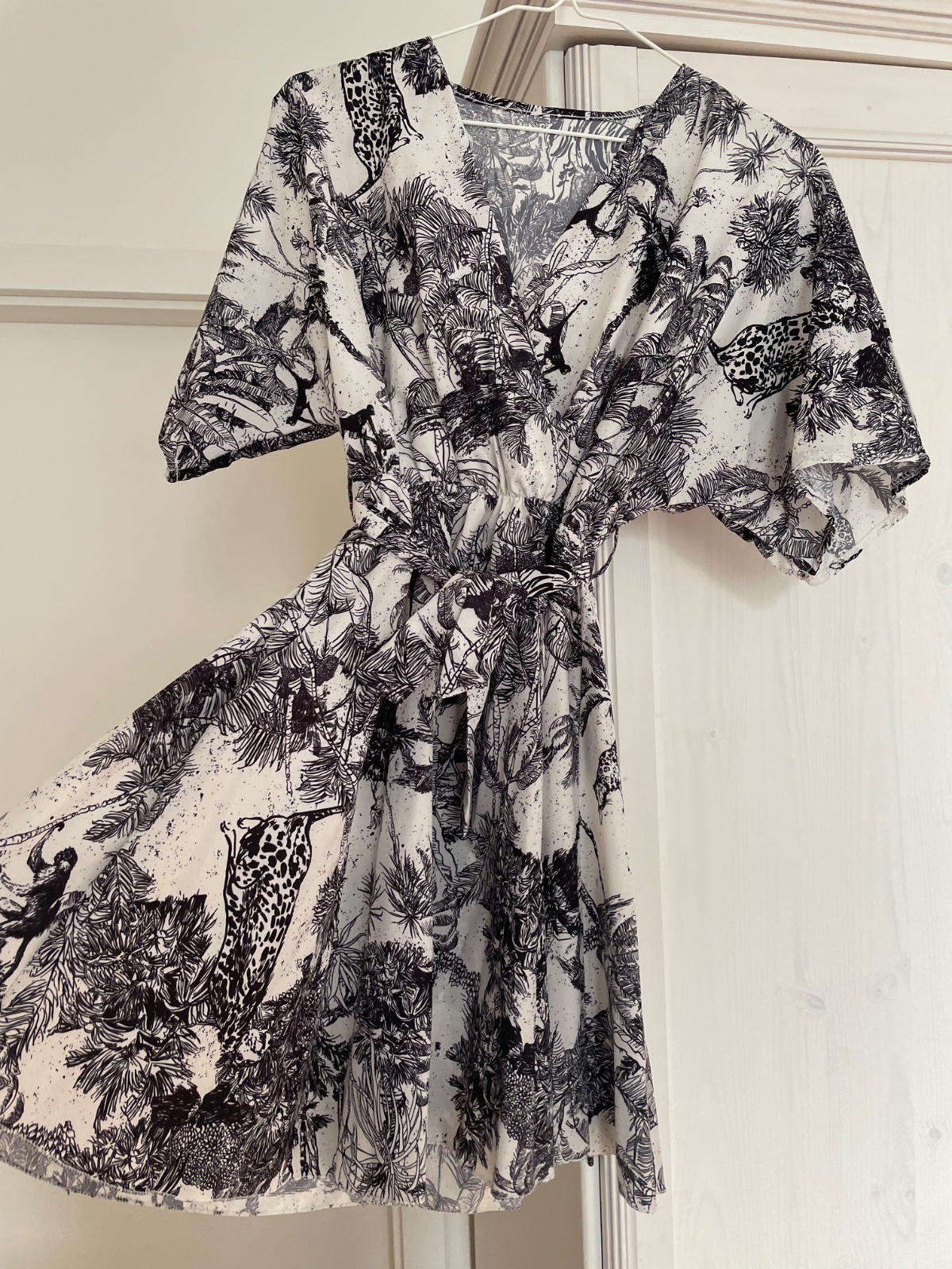 Dámske letné tenké šaty vzorované s krátkym rukávom. Elastická guma v páse. Farba biela,čierna,zlatá. Materiál: 100% viskóza. Veľkosť UNI ( vhodná pre S,M,L,XL). Krajina pôvodu: Taliansko. ROZMERY...