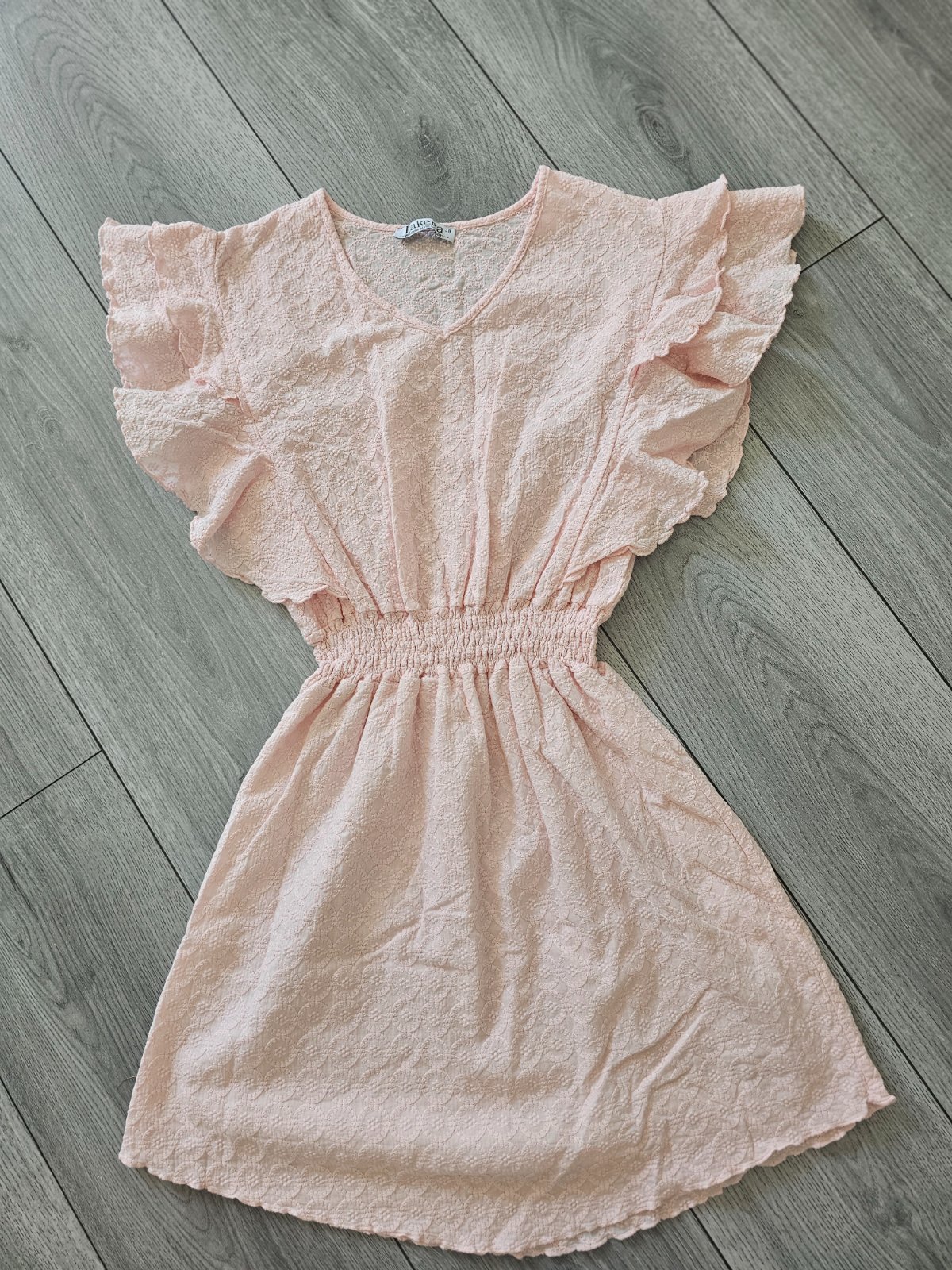 Veľkosť na štítku píše 38 ale sú menšie odporúčam také S 🙂 Krásne šatičky vhodné na nižšiu postavu 🙂 celková dĺžka 84cm