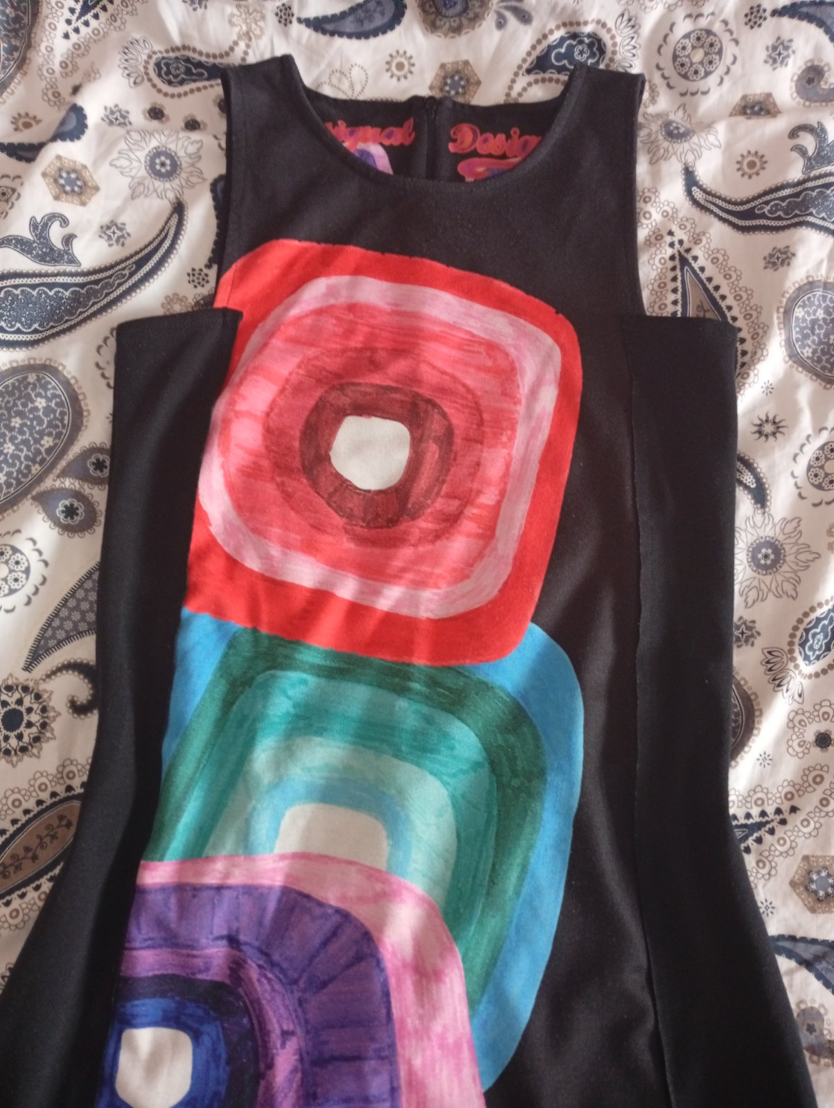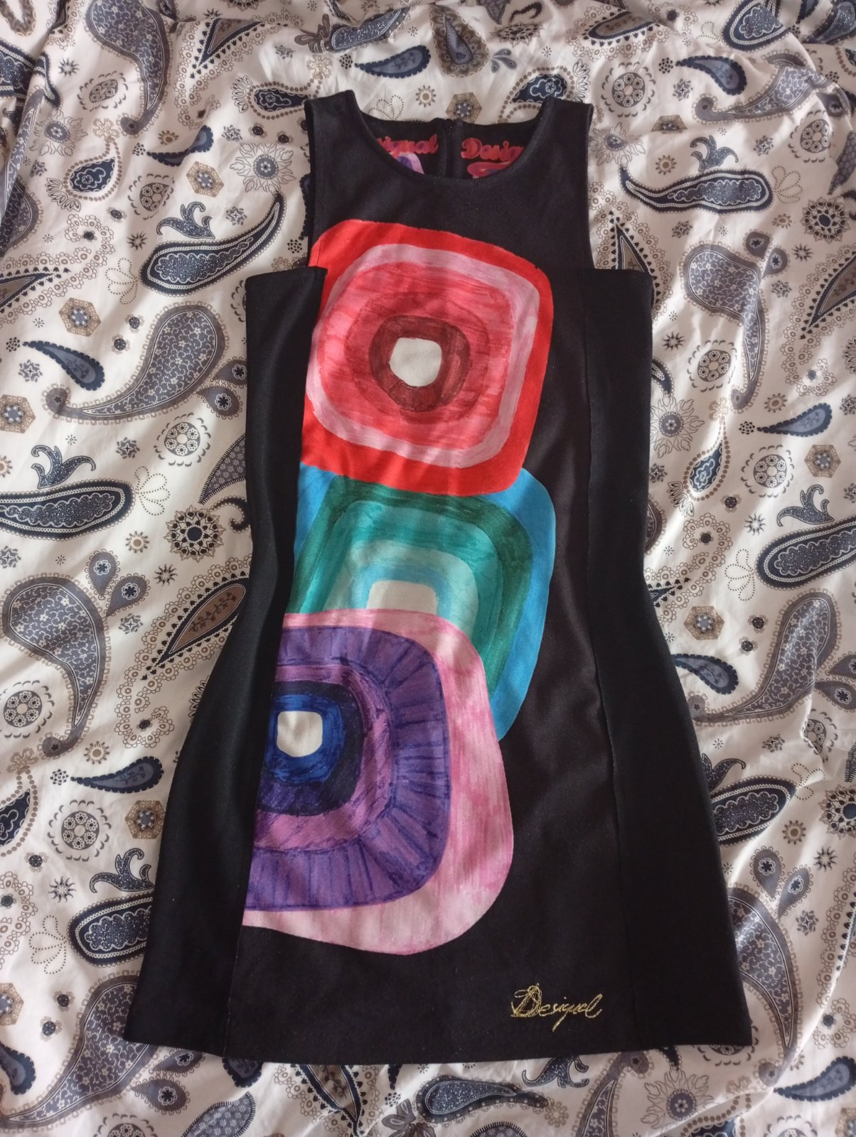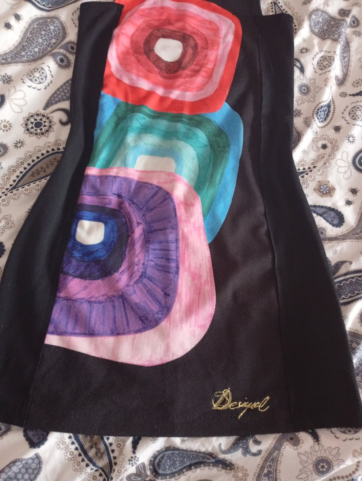Predám výnimočné priliehavé šaty č.36/38 zn.Desigual s farebnými vzormi Vzadu zips do pol chrbta.