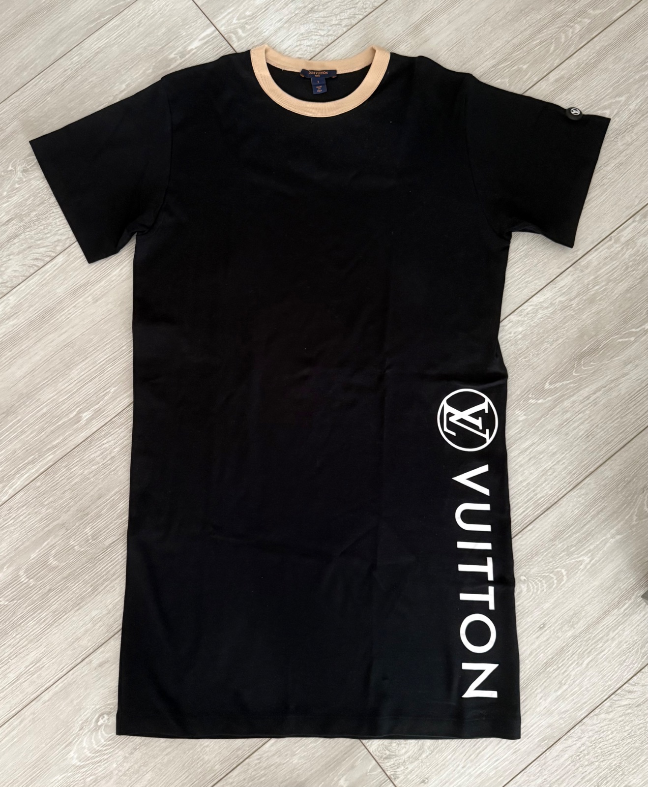 Krásne pohodlné bavlnené šaty Louis Vuitton. Čierna farba, dole biely nápis značky. Velmi dobrý stav, oblečené 2-3 krát. Veľkosť L.