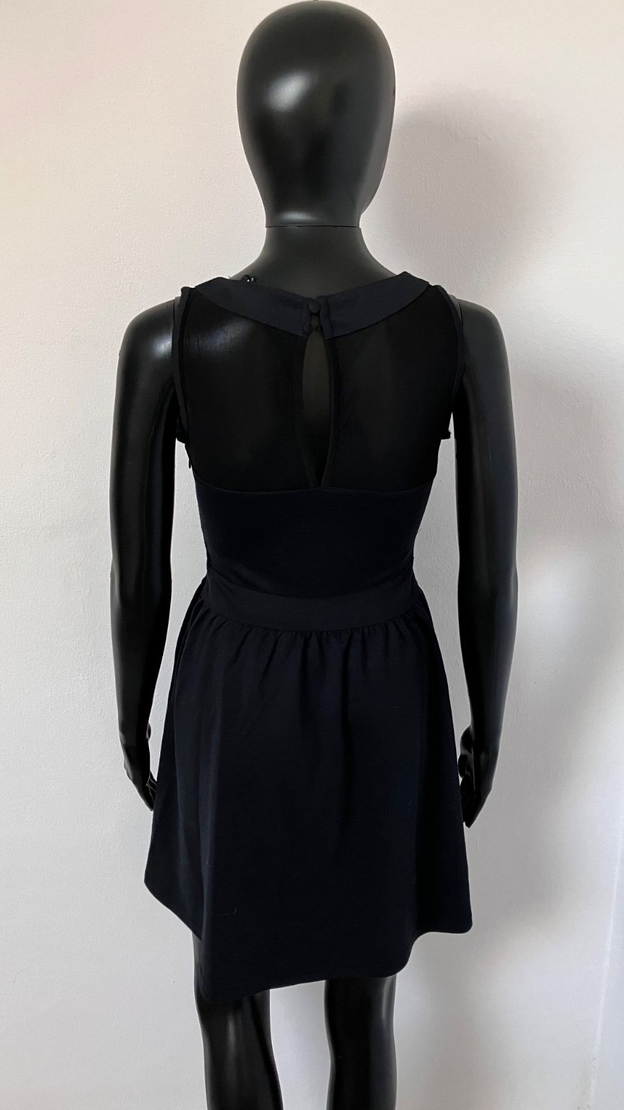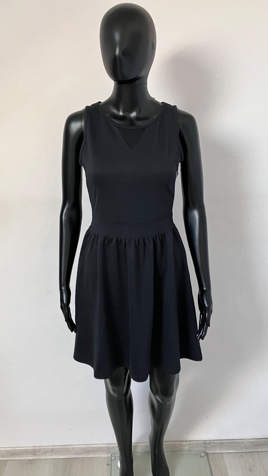 Dámske čierne šaty bez rukávov, áčkového strihu, elastické, tenké, zapínanie je na boku na zips, v dekolte aj na chrbte je priehľadná látka.