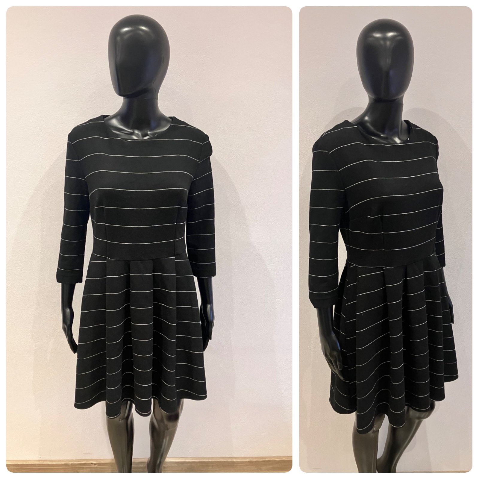 Dámske šaty s trojštvrťovým rukávom, pásikavé, hrubé, áčkové, elastické, okrúhly výstrih, zapínanie na boku na zips, materiál 61%polyester 34%viskóza 5%elastan.