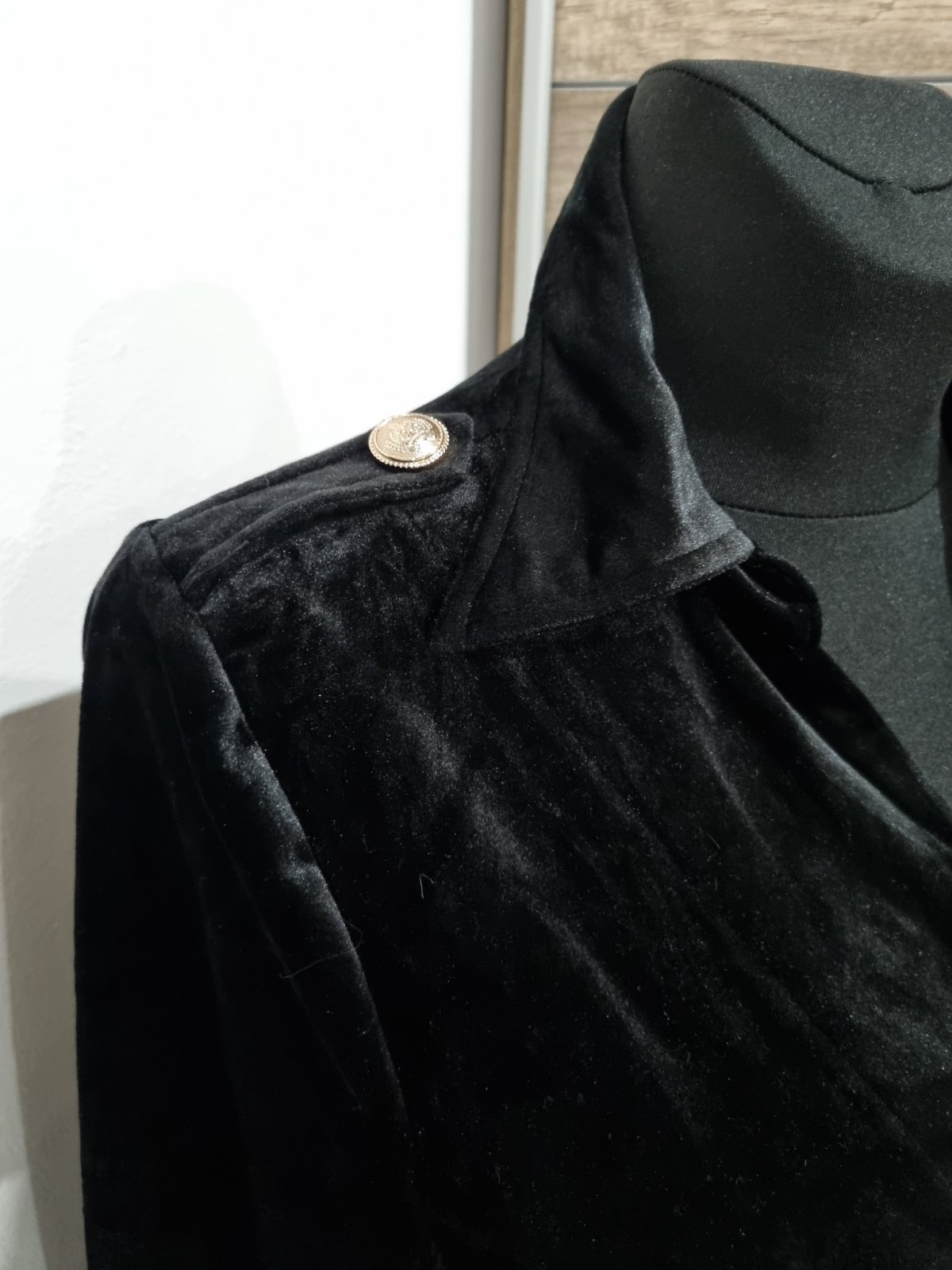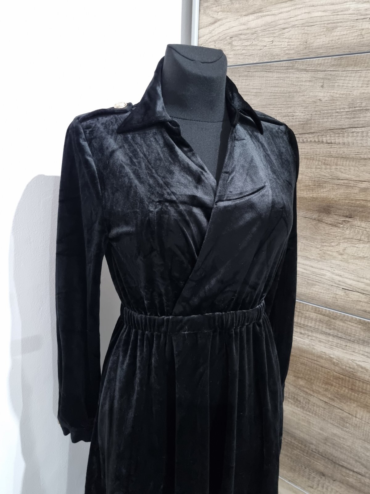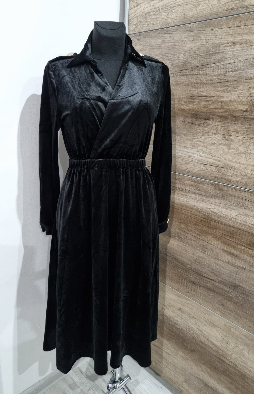 Elegantné spoločenské šaty vyrobené z čierneho zamatu.máju košeľový vrch s golierom, dlhé rukávy a elastický pás.