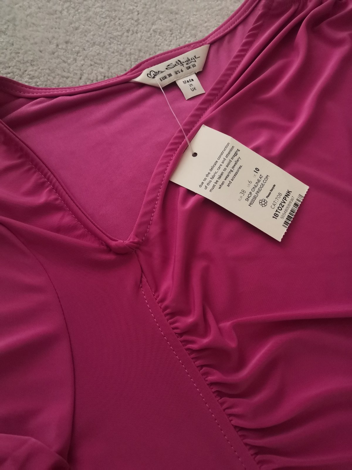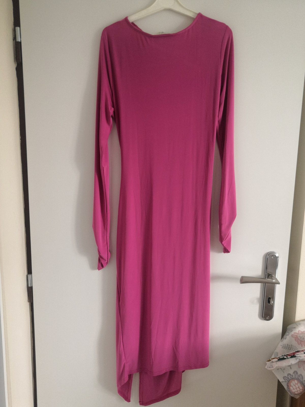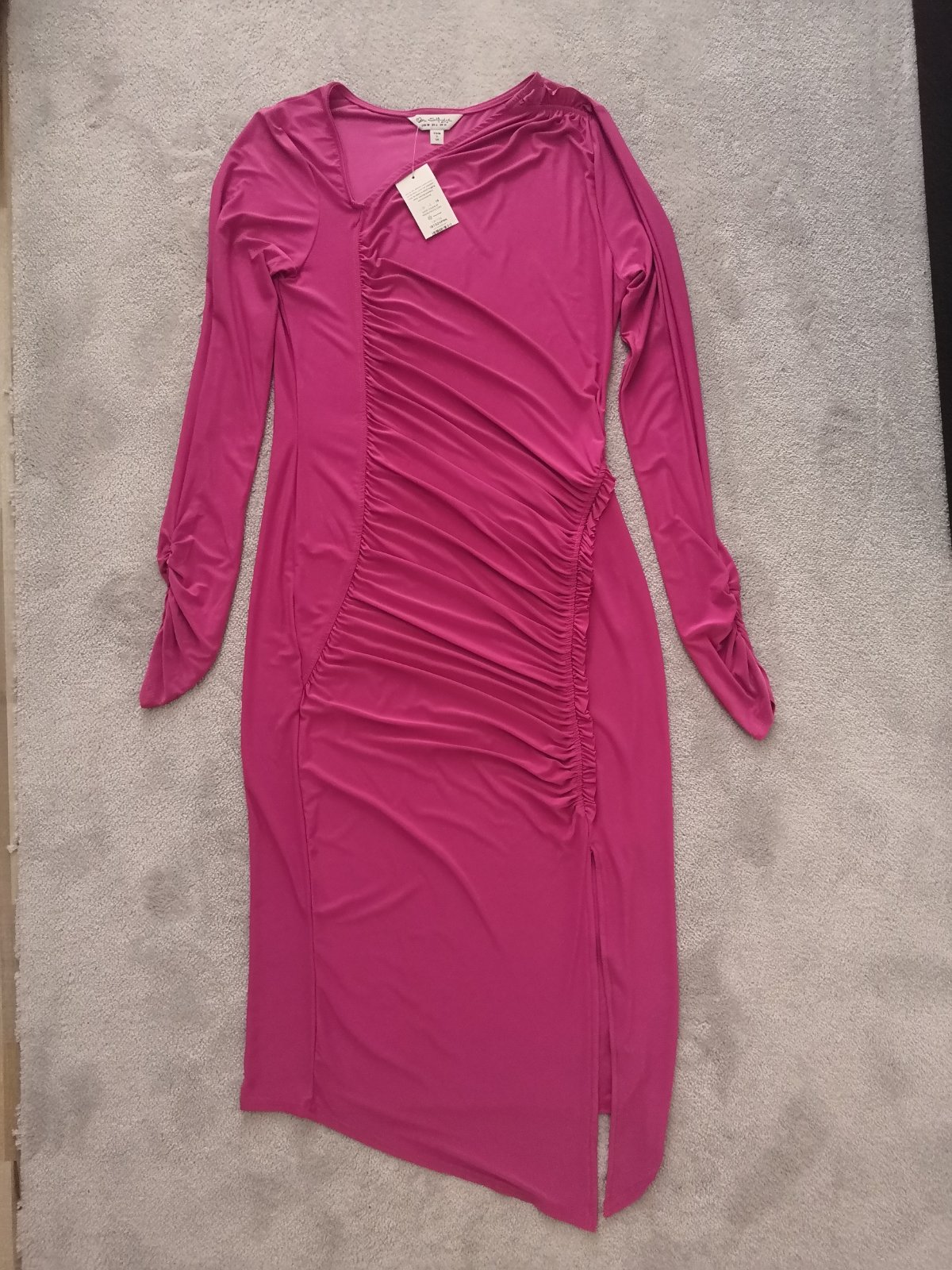 Nové krásne šaty, strih doplnený o riasenie, dlhým rukávom, bez zapínania, ešte s visačkou. Materiál: 95 % polyester, 5 % elastan. Vlastnosti materiálu: stálofarebný, pružný. Rozmery pre uvedenú veľkosť dĺžka - 117 cm. Ženám s výškou 170 cm by mali šaty siahať do polovice lýtok. Pôvodná cena 51,95€. Materiál je elastický pekne ukáže na postave, ktorá má rozmery v uvedenej veľkosti - šírka cez prsia okolo 90, pás okolo 70cm, boky 98cm.