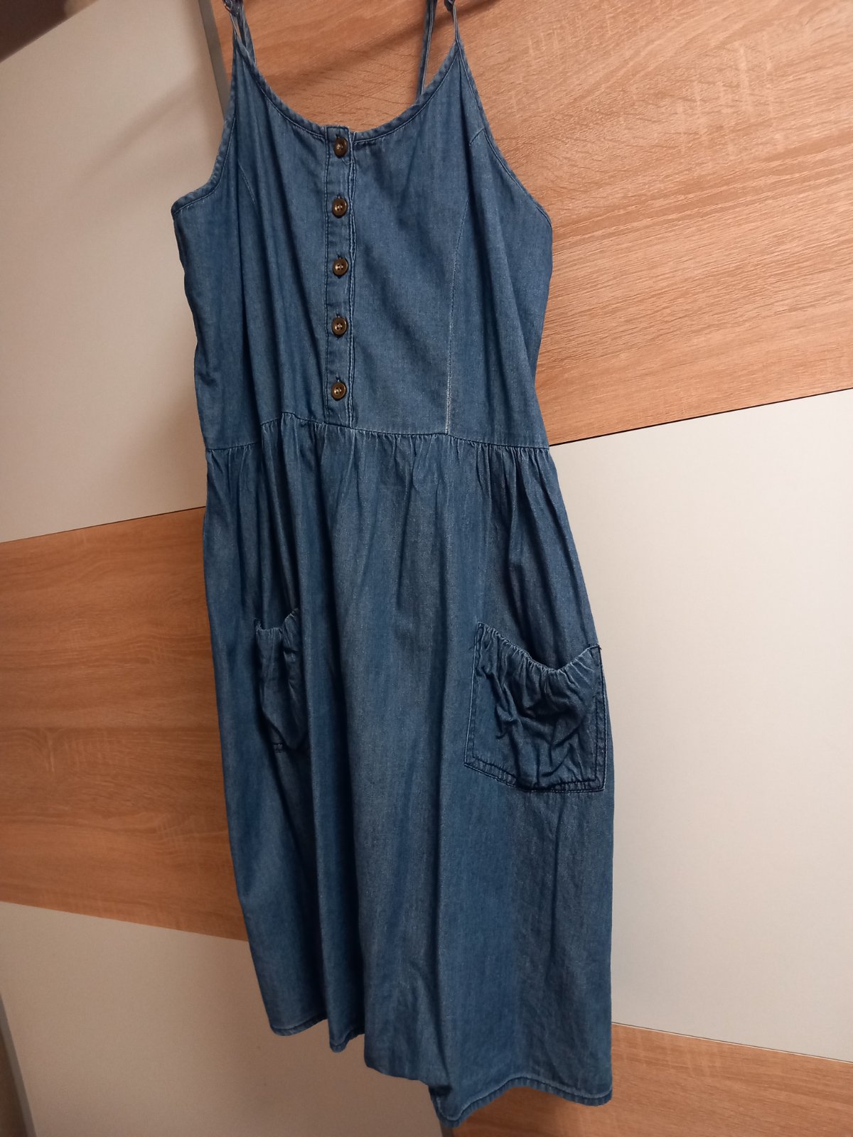 Veľmi pekné ľahunké riflové šatky. Nádherná aplikázia v predu. Kupované v zahraničí. Vzadu jedna mala nepatrná dierka zo zatiahnutia.