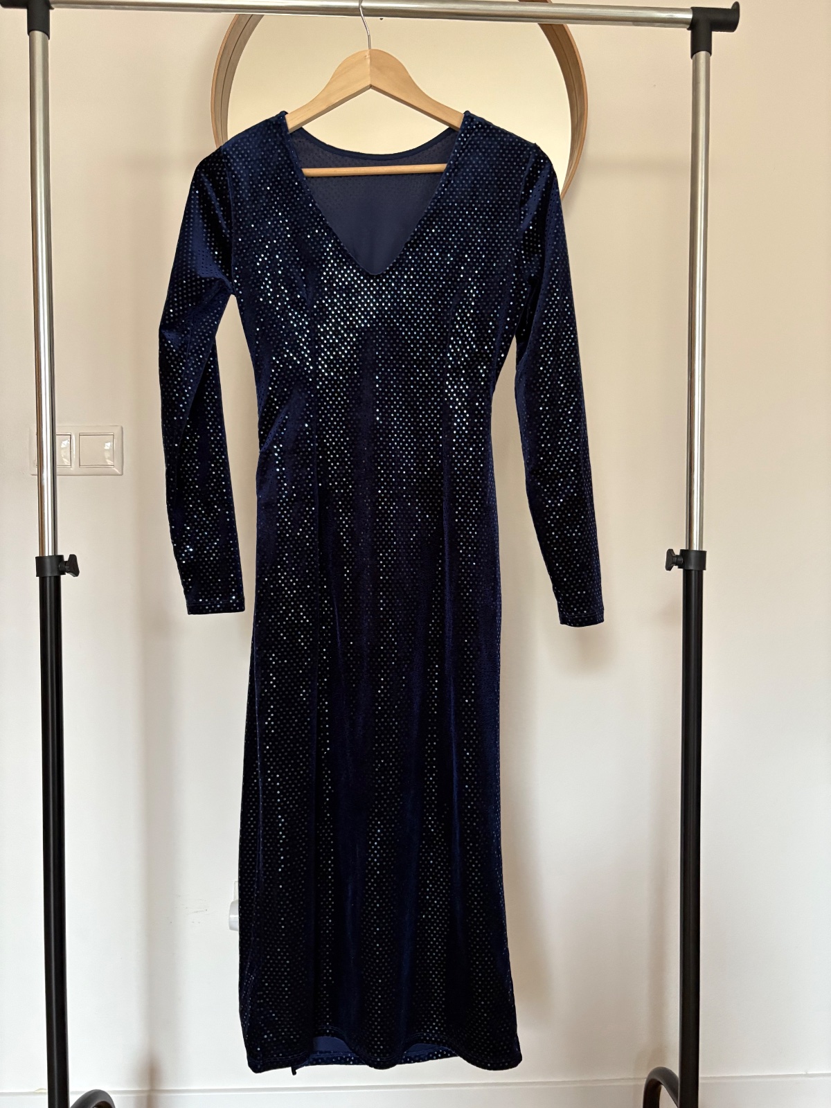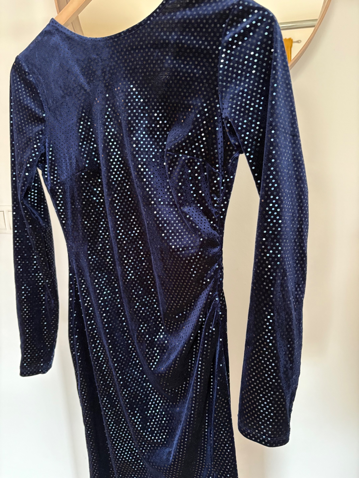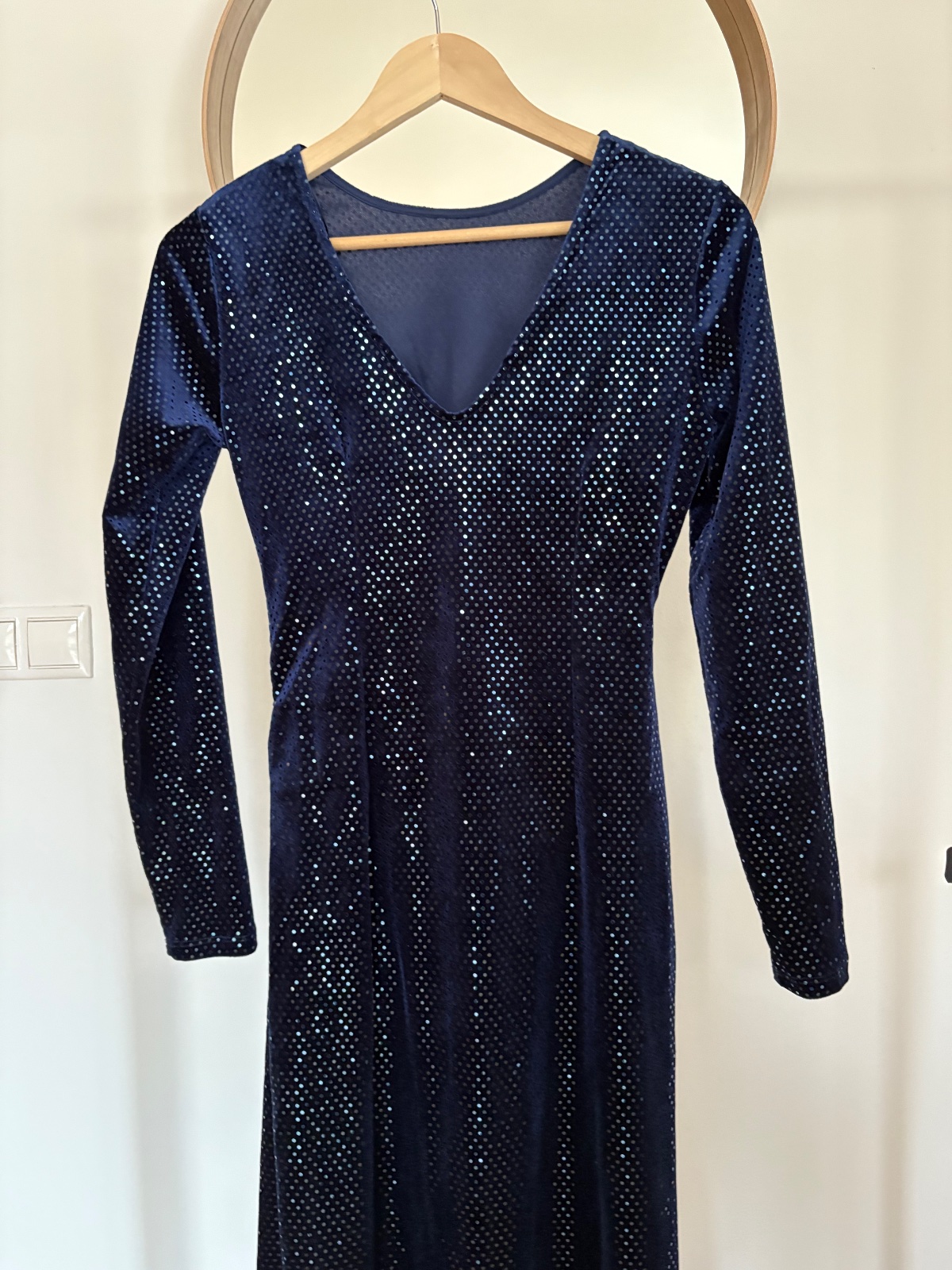 Kvalitne velmi pekne šaty,berlínska modrá farby so vzorom.100%viskoza.super stav,ako nove. se27 Rozměry: vel.S,vel.36,cez prsia 2x45cm,cez pas 2x39cm,dl 95cm. Velikost: 36 Značka: INDI...