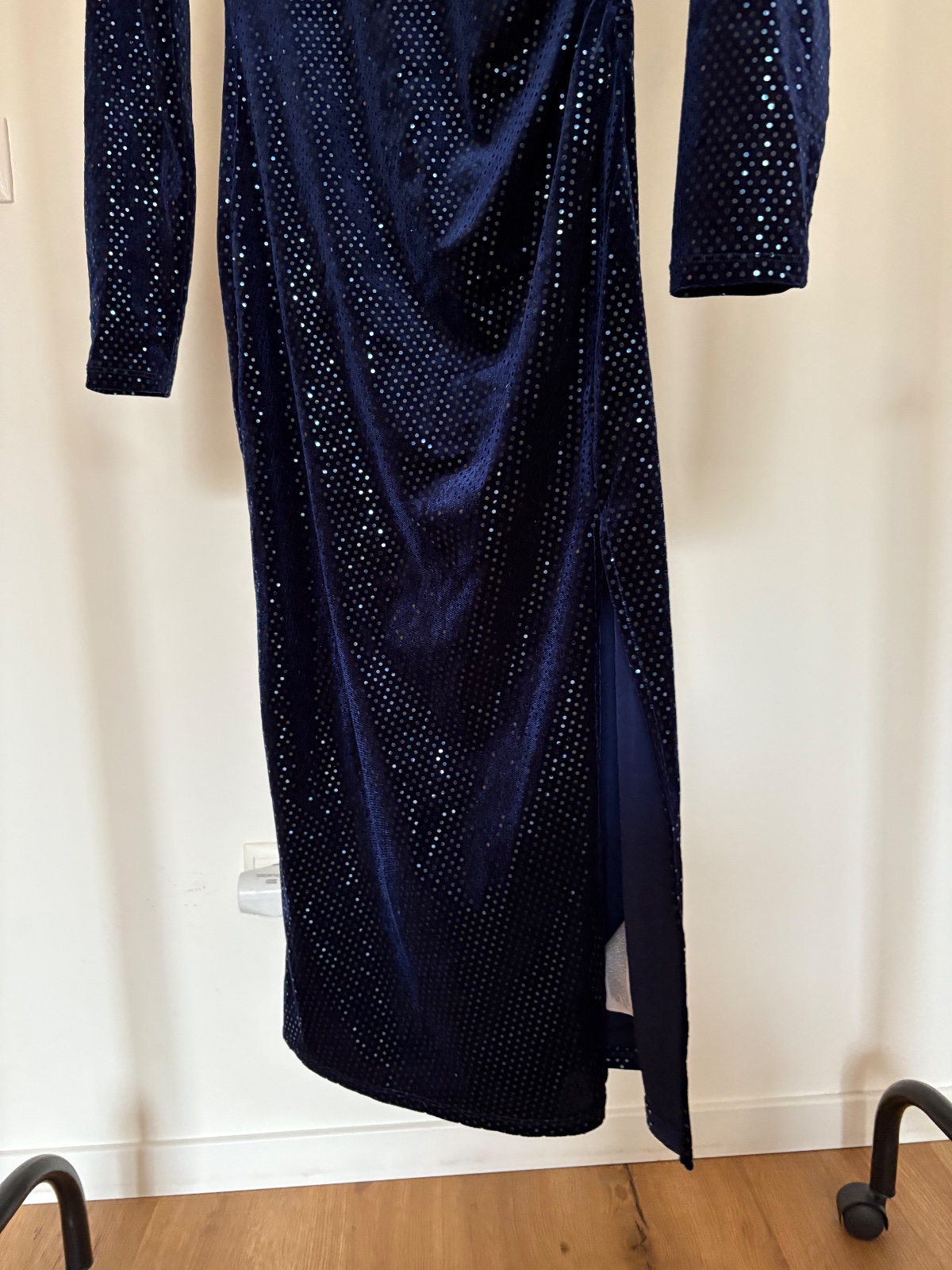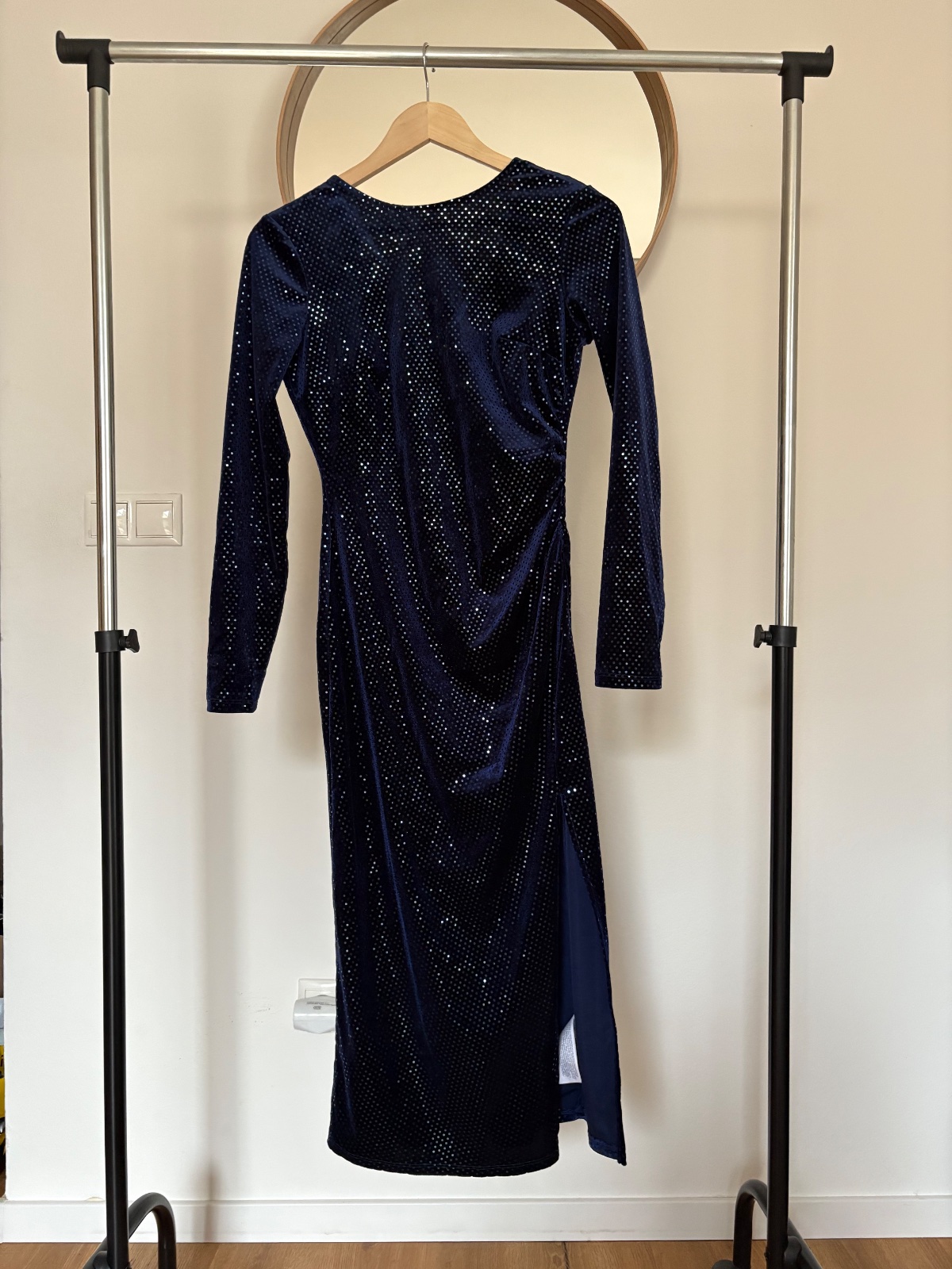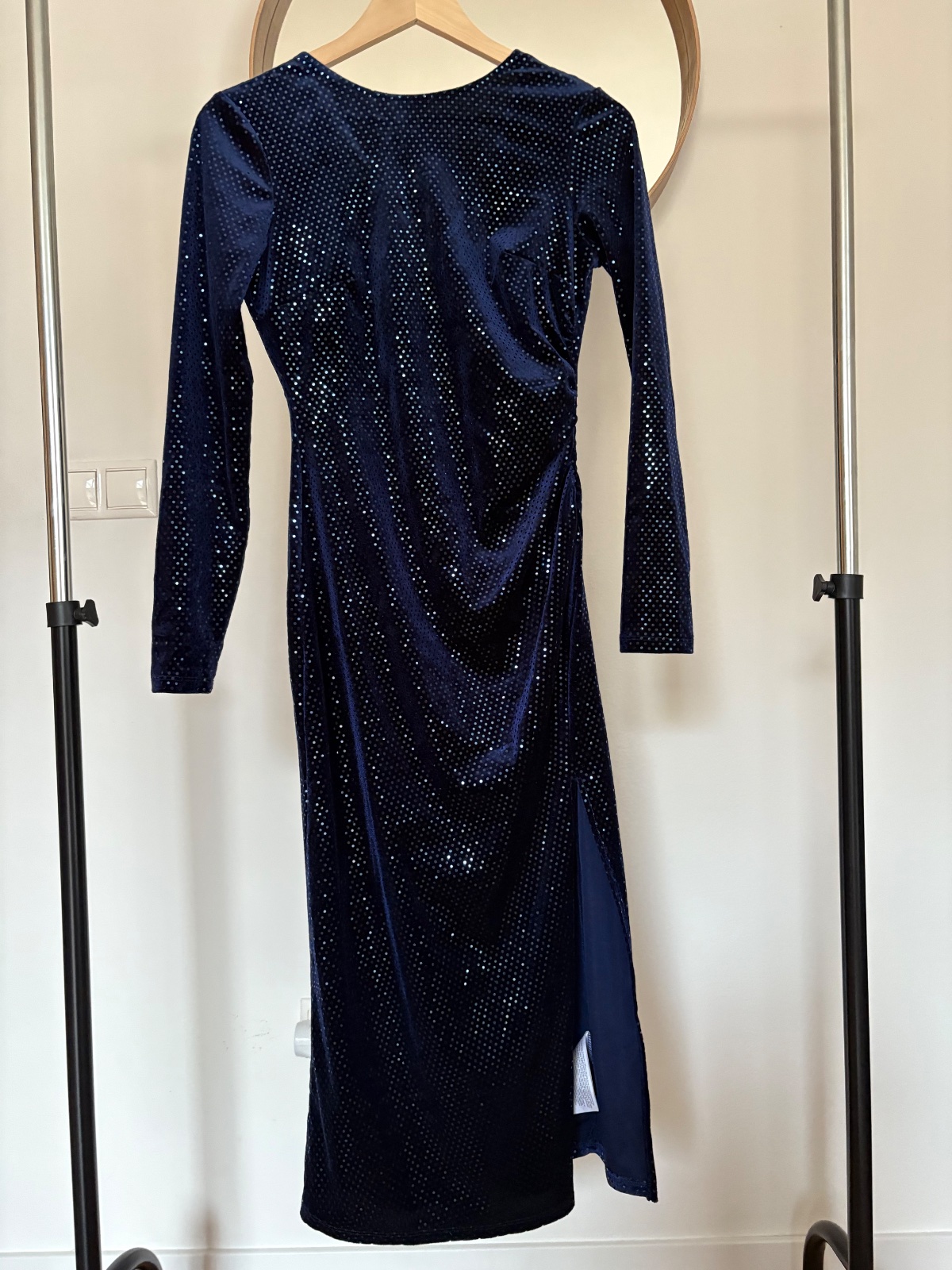 Kvalitne velmi pekne šaty,berlínska modrá farby so vzorom.100%viskoza.super stav,ako nove. se27 Rozměry: vel.S,vel.36,cez prsia 2x45cm,cez pas 2x39cm,dl 95cm. Velikost: 36 Značka: INDI...