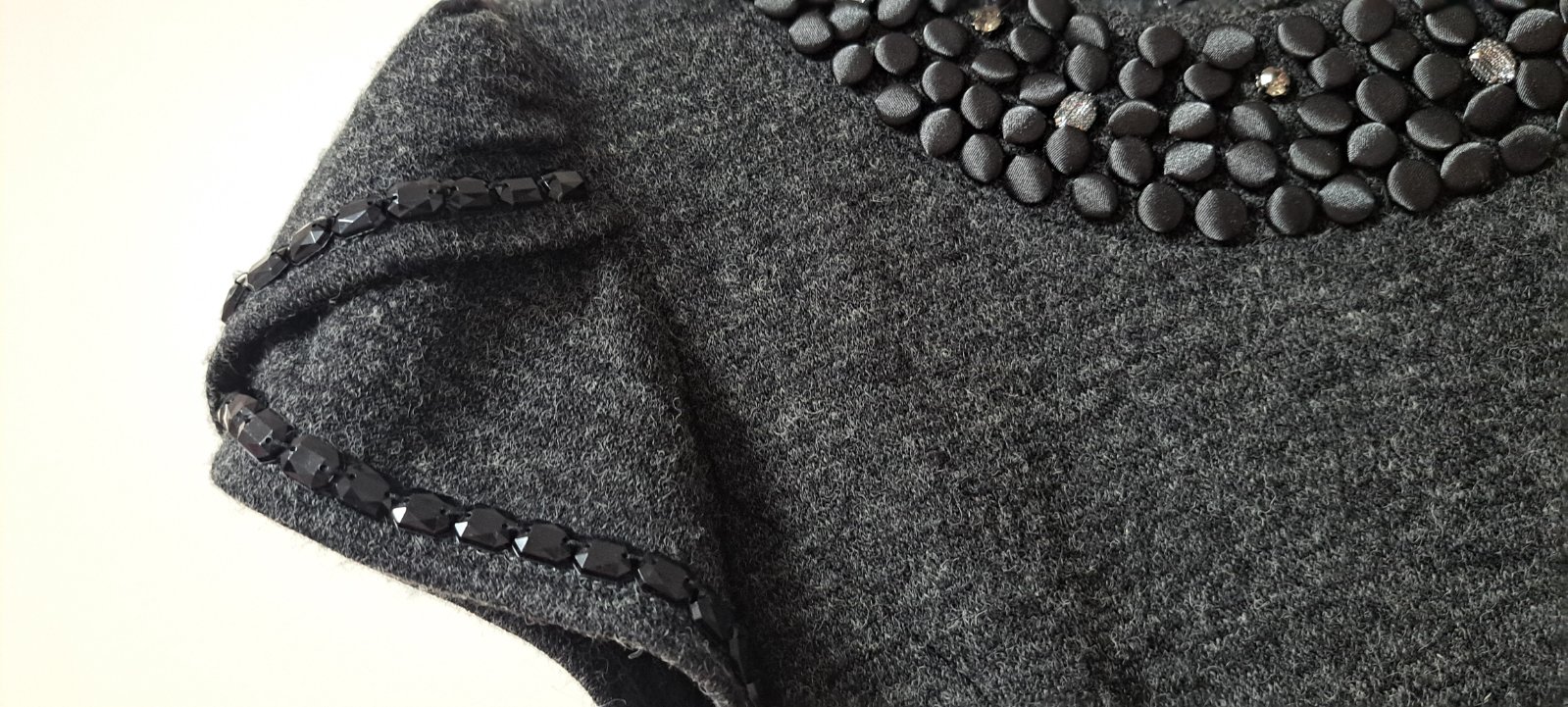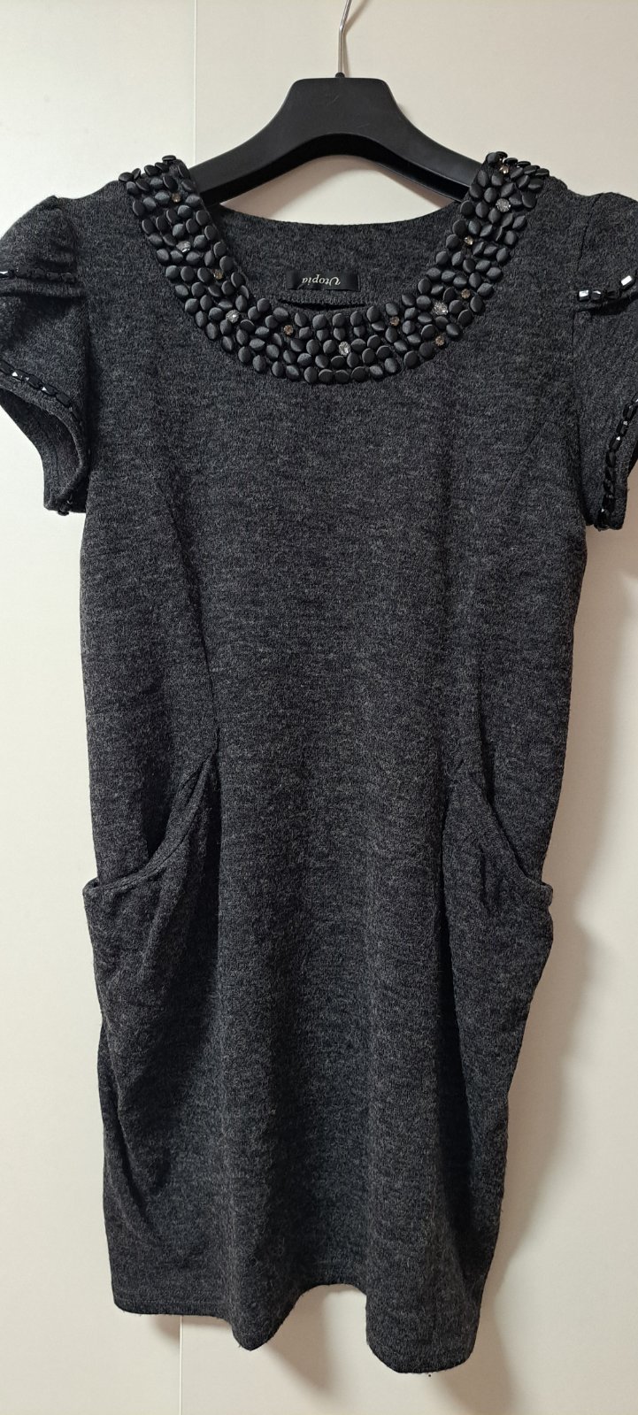 Kratke saty s golierikom. Hrubsi material na jesen/zimu. Nekrci sa.Melirovana tmavosiva farba. Na stitku velkost 38, ale sedi na S. Robia krasnu postavu.