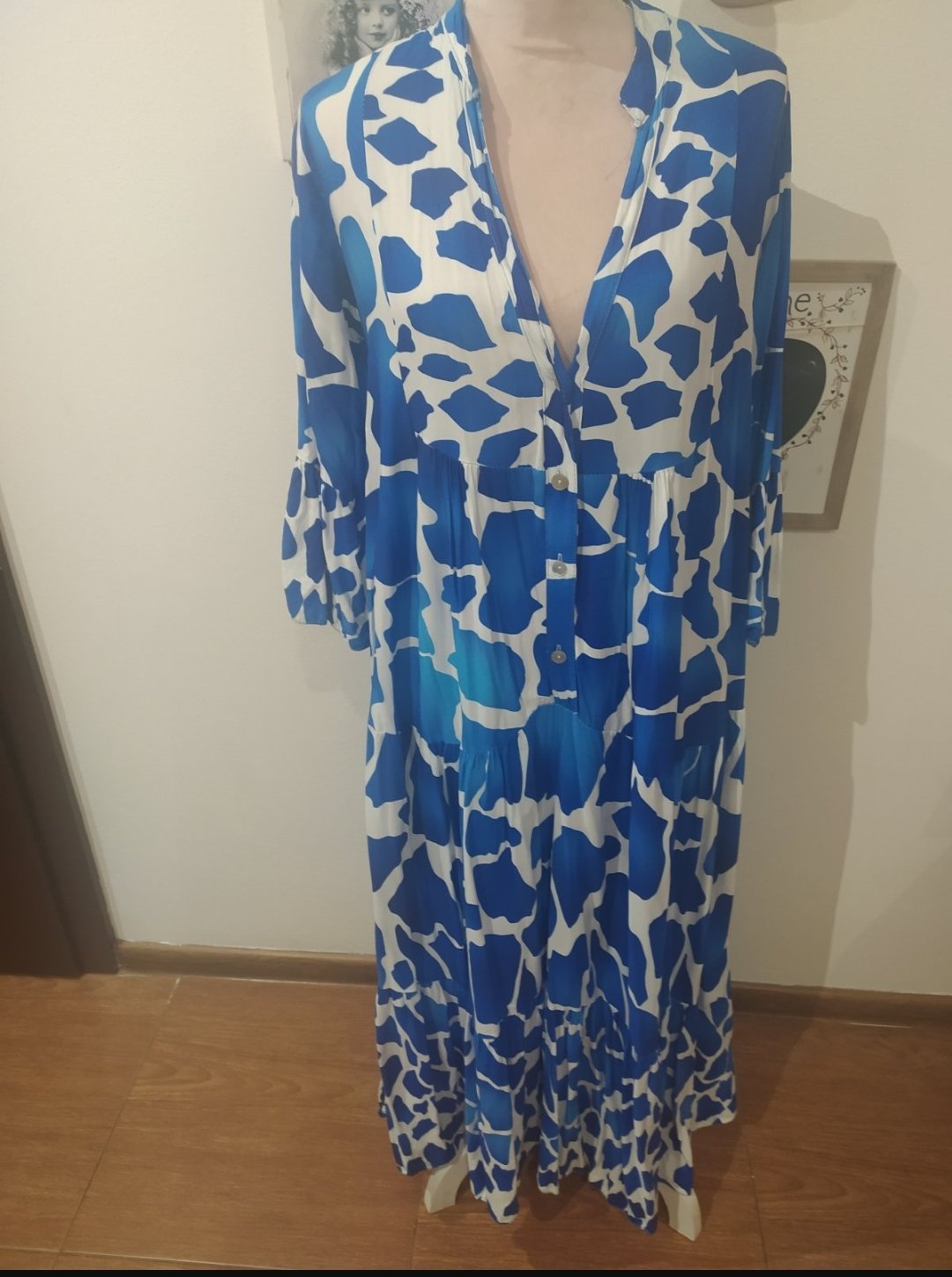 Dámske maxi šaty s 3/4 roll-up rukávom , volánom, opaskom, vzorované, tenké. Šaty majú golier, a hore majú zapínanie na gombíky. Nie sú elastické. Hladký materiál. Materiál:100%polyester. Veľkosť U...
