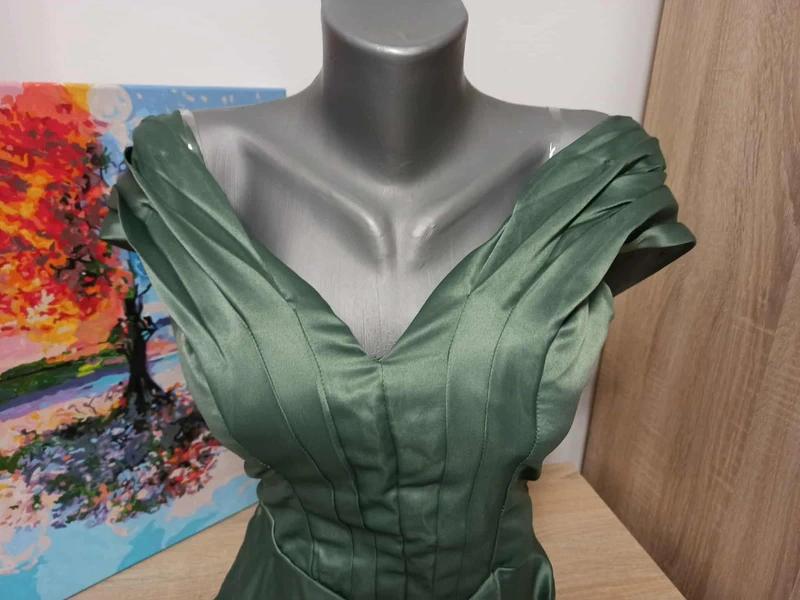 Nové olivovozelené krátke saténové šaty so spadnutými rukávmi.Korzetový štýl,vzadu na viazačku,súčasťou sú aj priesvitné ramienka.Materiál je hrubší lesklý satén.Šaty krásne sedia,mne sú žiaľ veľké.