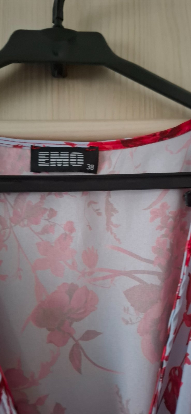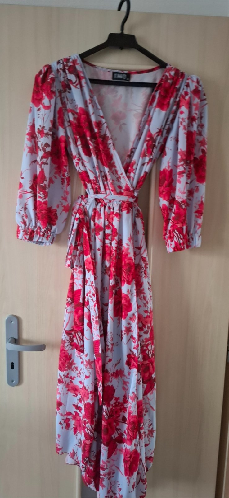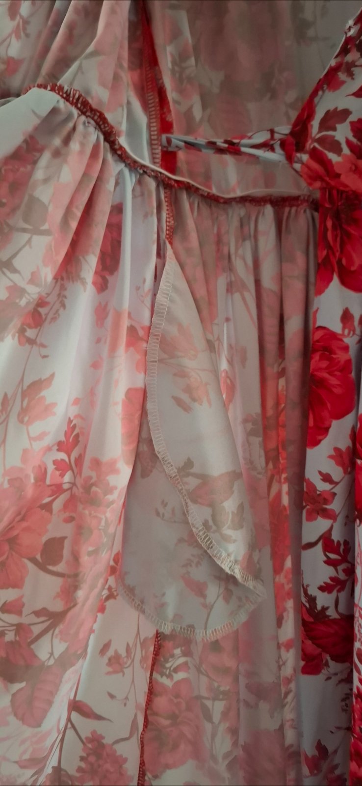 Kvetinové šaty, pod kolená, vzadu predĺžené, vypchávky v ramenách, zavynovacie, elegantné, nežné aj príležitostné. Bledomodré a červené ruže.