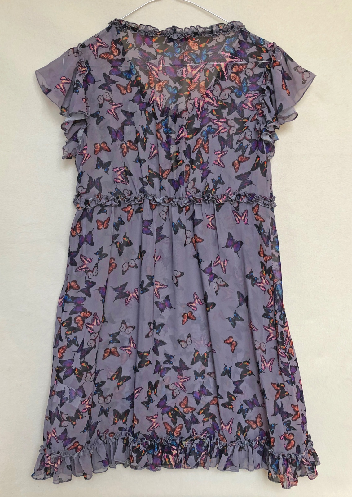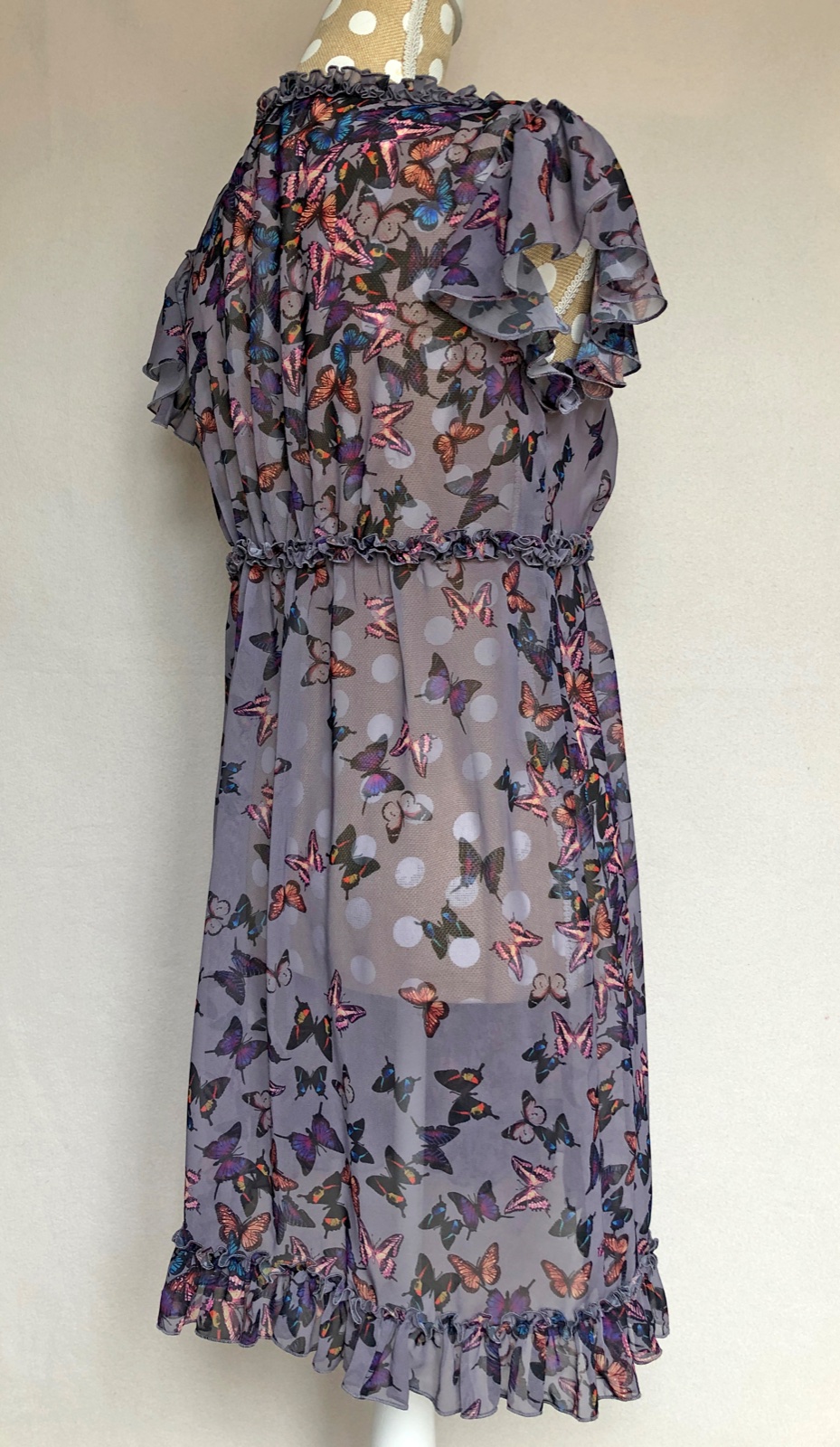 Letné vzdušné šaty vo fialovo-šedej farbe s farebnými motýľmi. 100% polyester.