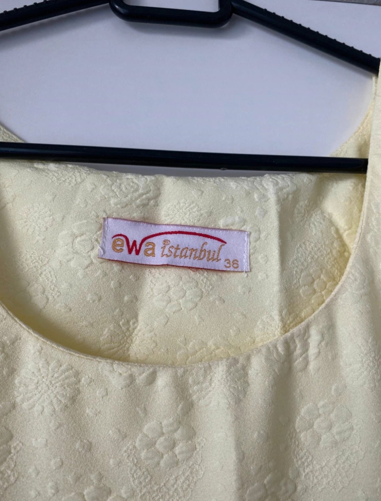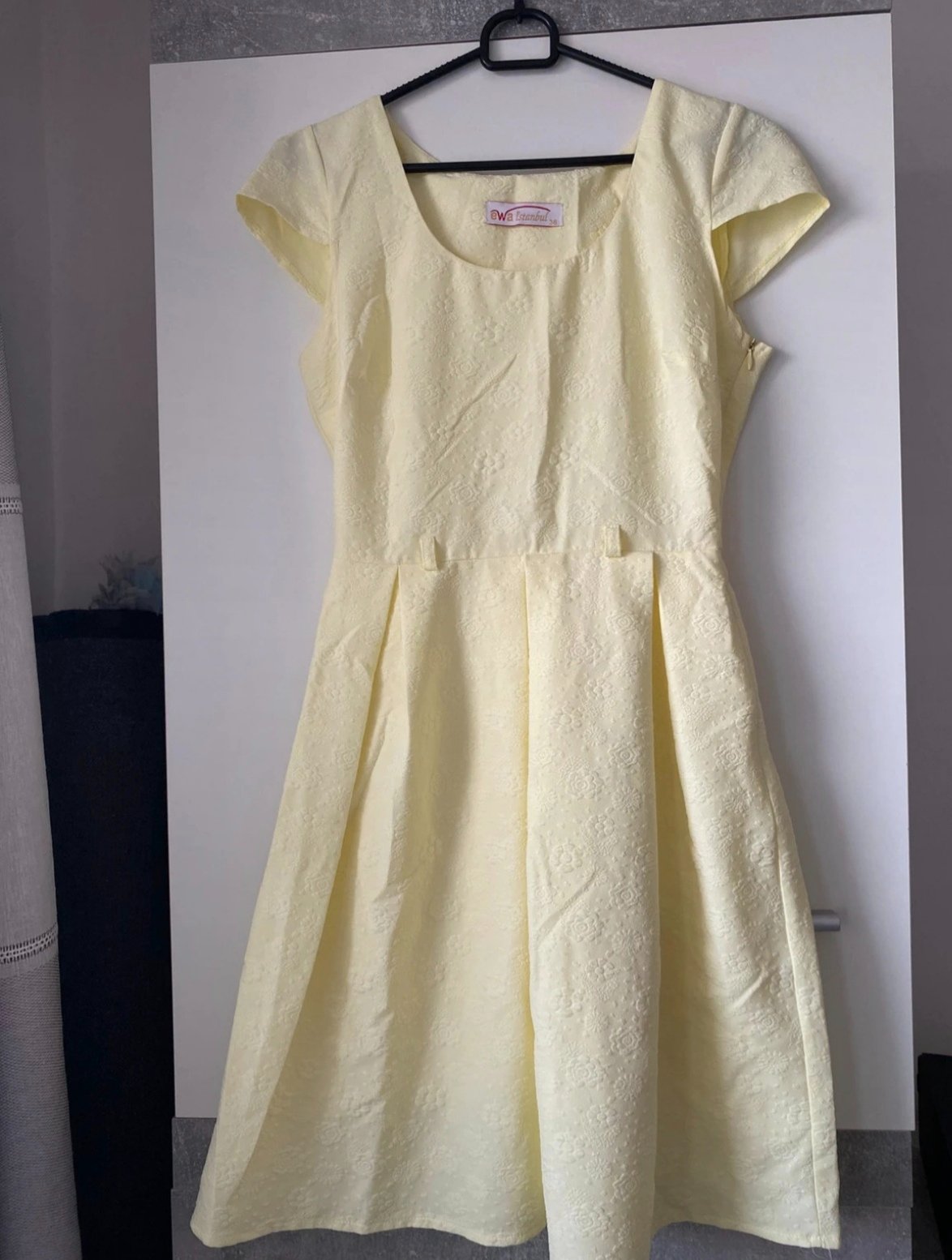 Jemné žlté spoločenské šaty s krásnou potlačou jemných kvetov, raz oblečené, bez poškodenia. Na foto pokrčenie zo státia v skrini, ľahko sa vyrovná.