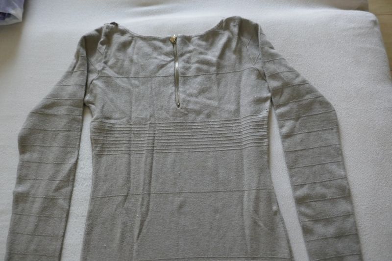 Pletené šaty vhodné na chladnejšie obdobie. Farba je taká bledohnedá alebo bledosivá, neviem, ako ju definovať. Sú nosené, ale v dobrom stave, budem rada, ak niekomu ešte poslúžia. Priliehavý strih