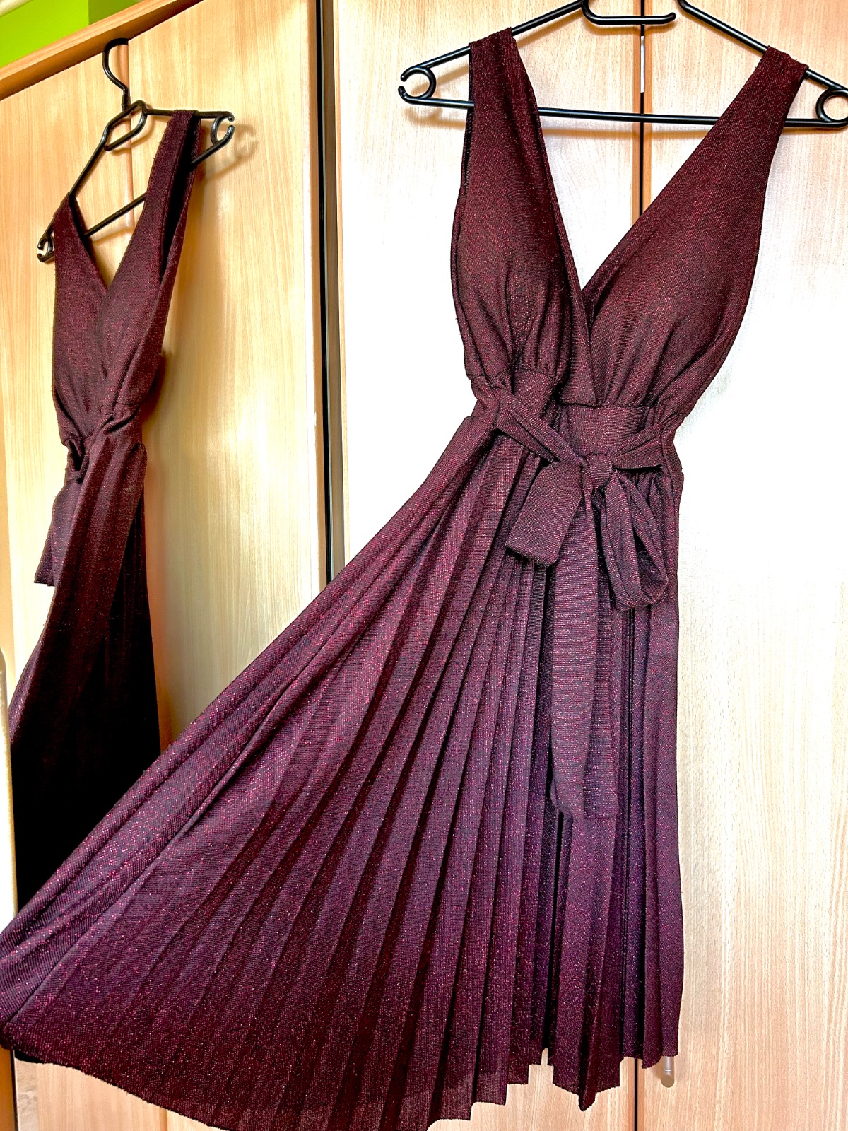 S visačkou. Mašlička sa dá zaviazať dopredu alebo dozadu. Majú vypchávky na prsiach. Trblietky neopadávajú. Veľkosť uni-elastické. Maximálne natiahnutie pod prsiami cca 43-44.