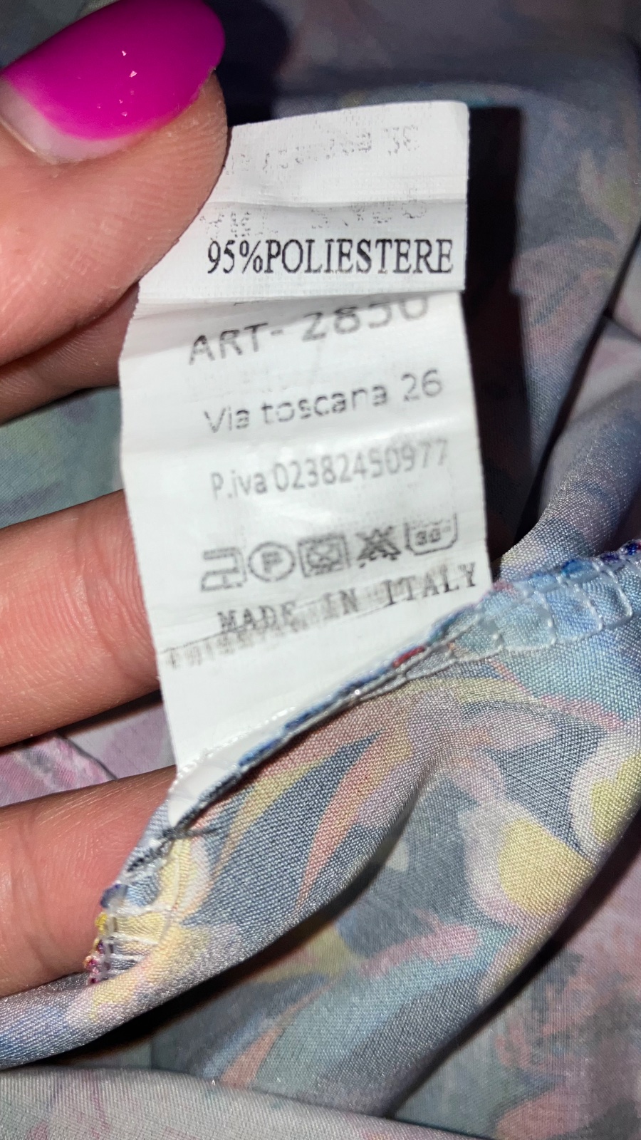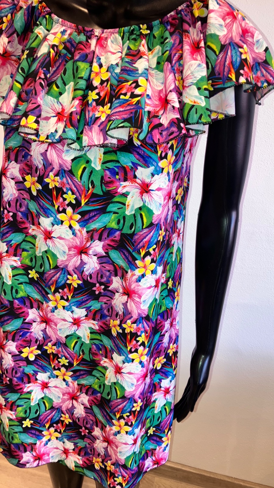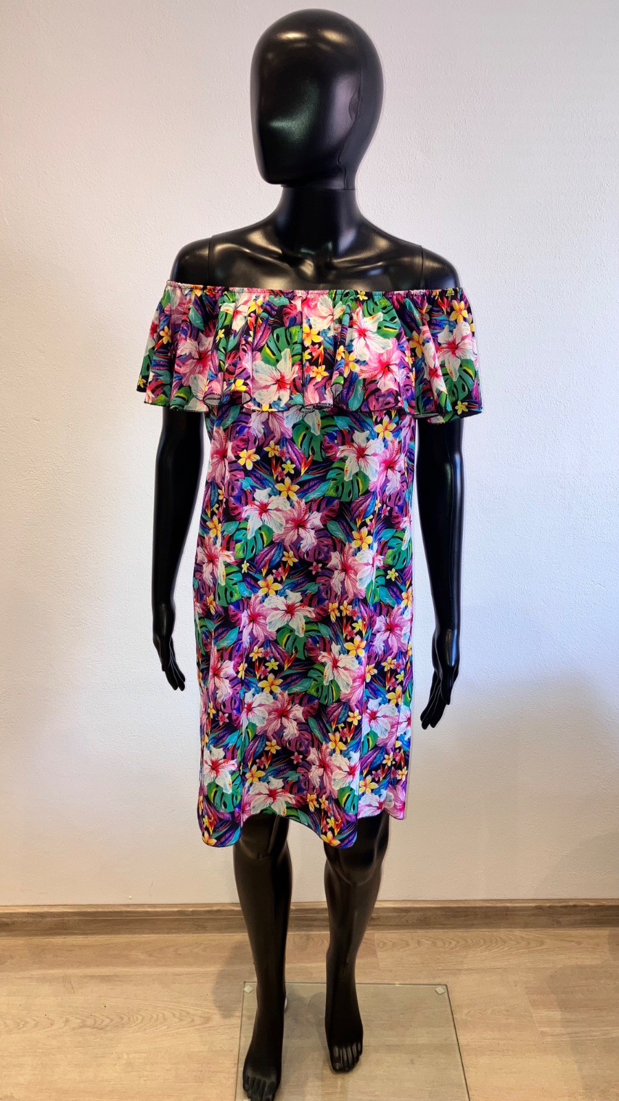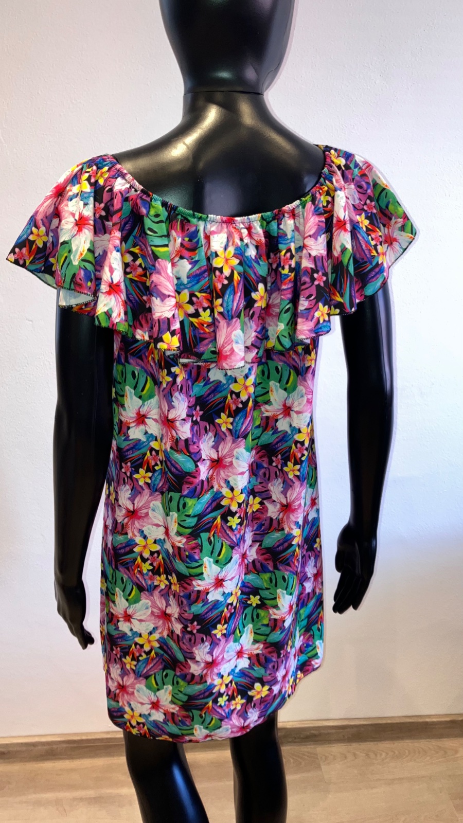 Dámske kvetované šaty s odhalenými ramenami a volánikmi. Tenké, letné, nie sú elastické, len gumička na ramene. Veľkosť cca L. Blúzková látka.