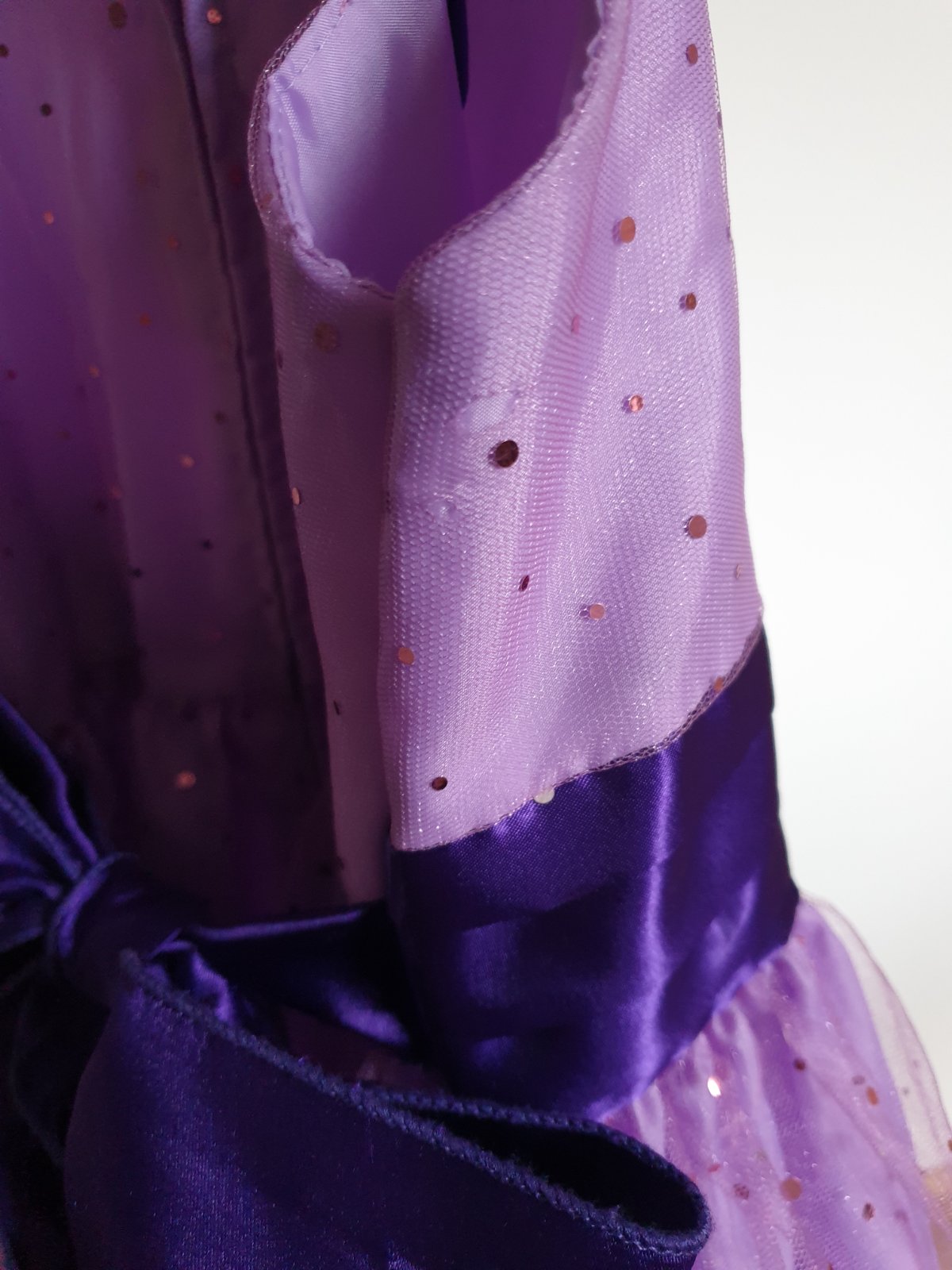 Krásne šatičky na svadbu alebo karneval dovezené z USA. Majú však chybičky krásy, viď.foto, preto je cena symbolická. Celková dĺžka šiat je 85 cm. Mašľa na páse sa dá odopnúť. Vzadu prešite krížom, viď. foto, nie je to vidno pri nosení, len keď sa týl roztiahne.