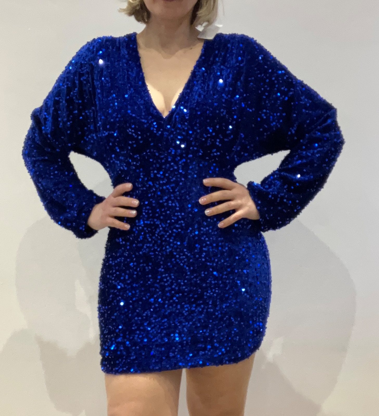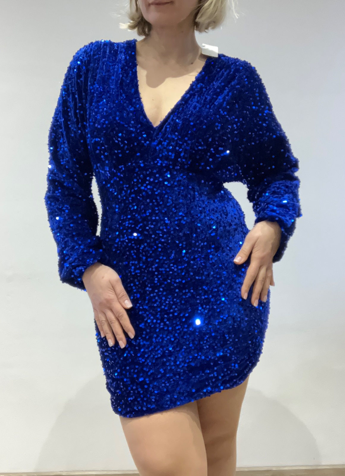 Dámske elegantné flitrované šaty s dlhým rukávom a véčkovým výstrihom. Zamatové. Elastické. Šaty s podšívkou a gumičkou v páse. Rukáv ukončený gumičkou.