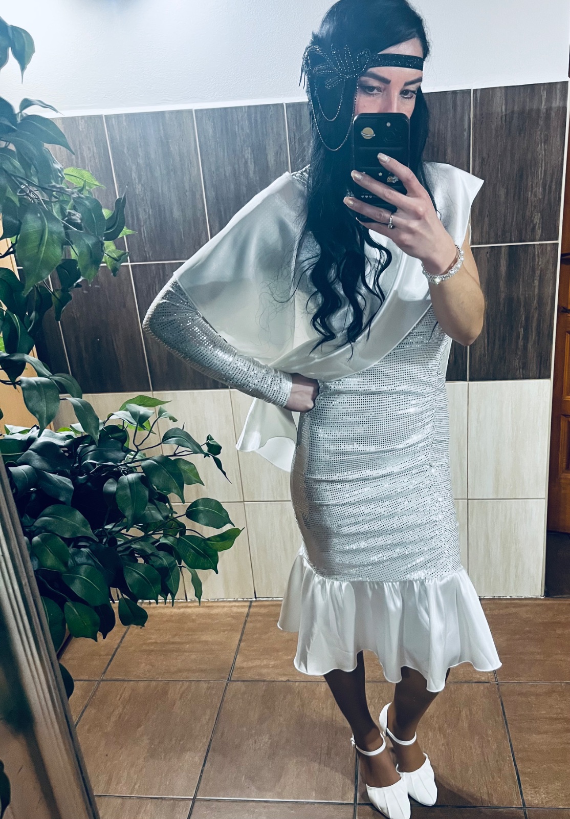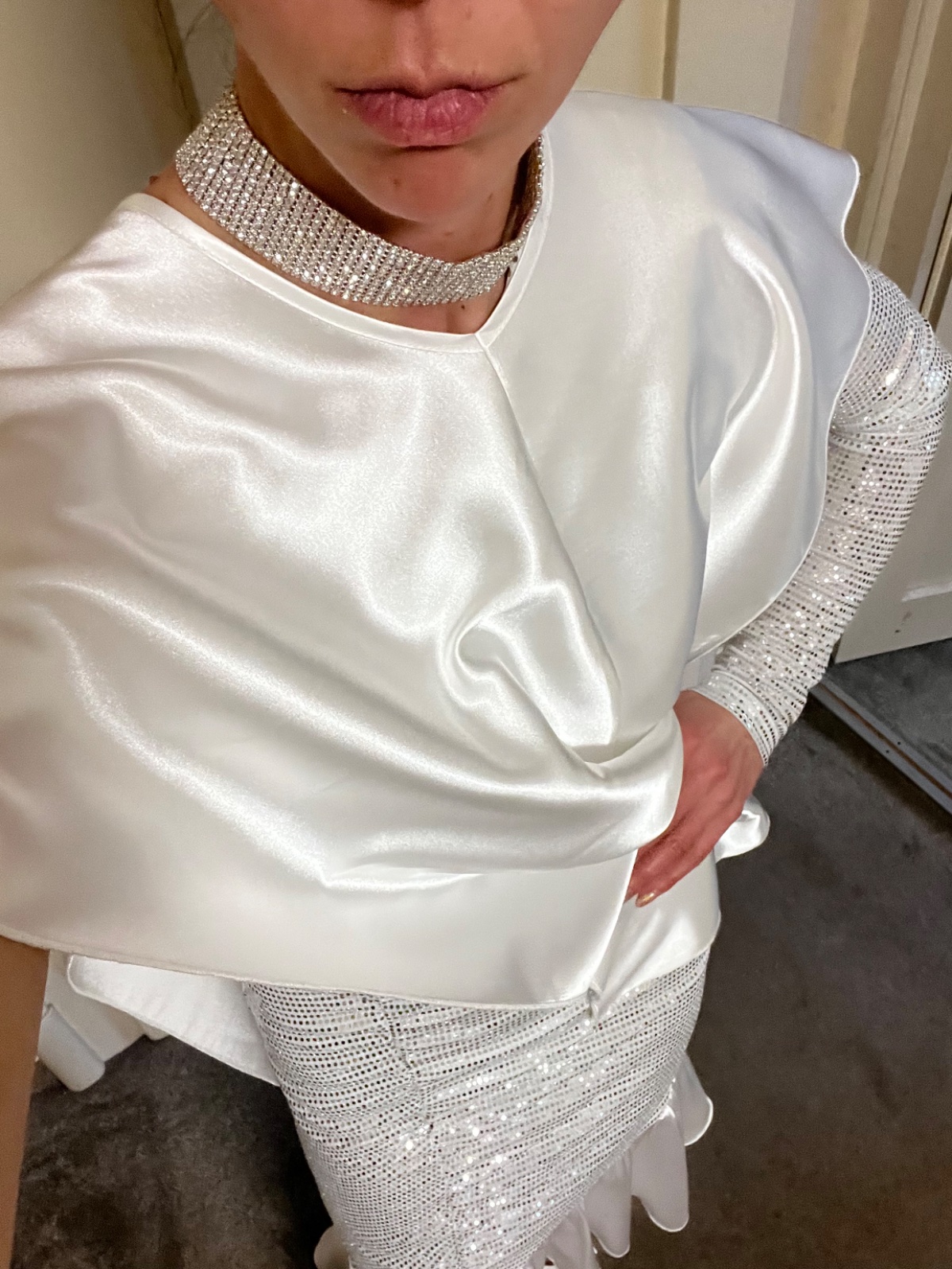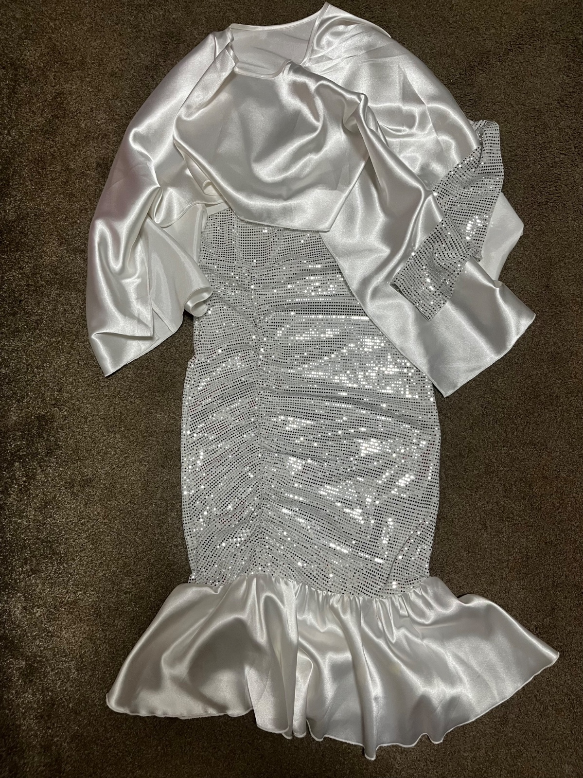 Bez poškodení. Šálik sa dá dať rôzne. Prevlieka sa cez hlavu. Bez jedného rukáva -šaty