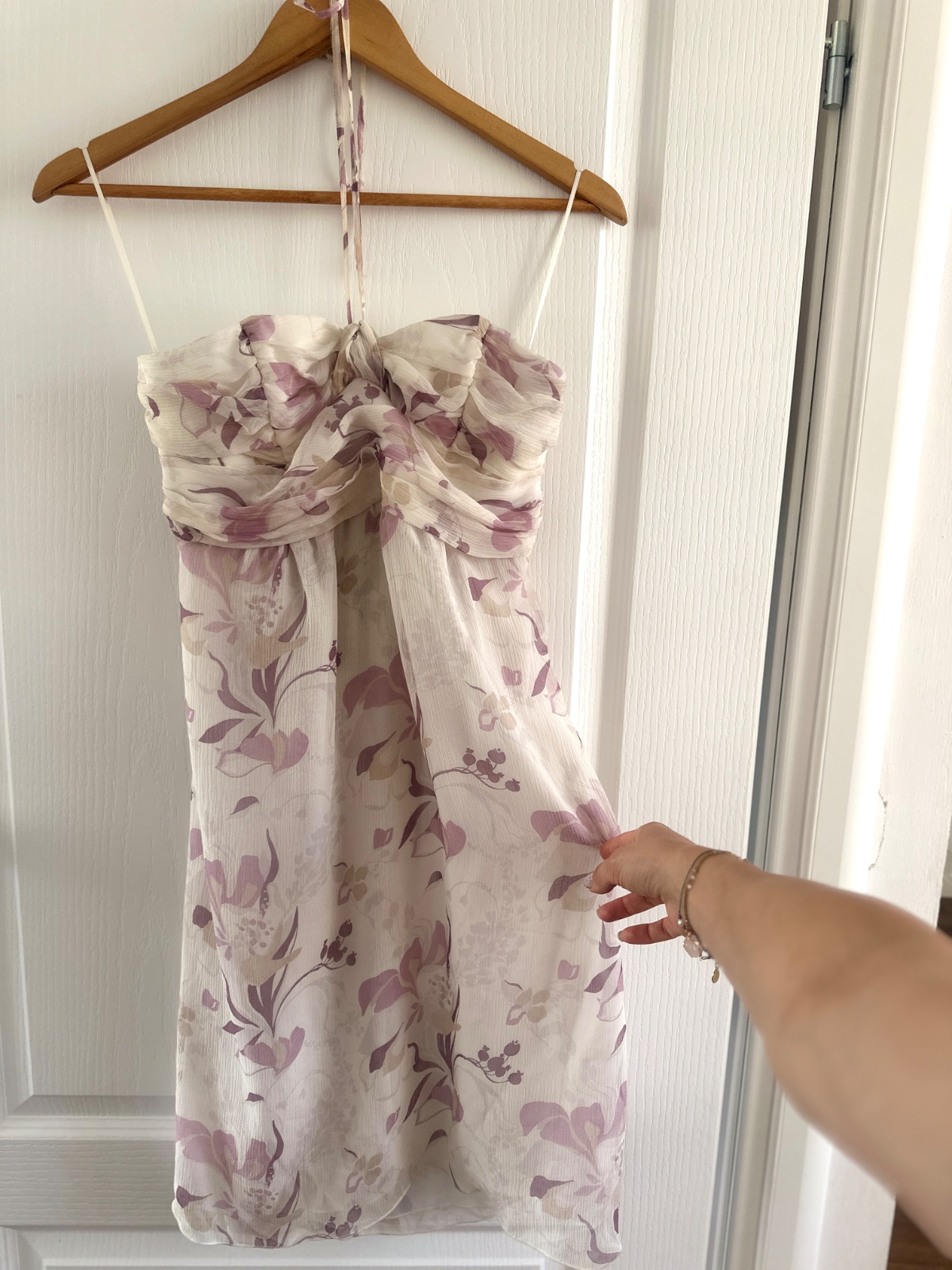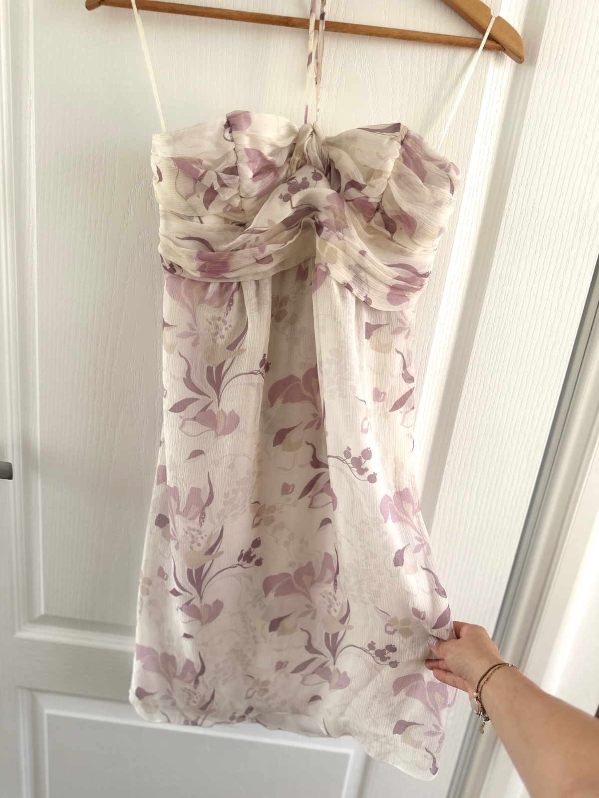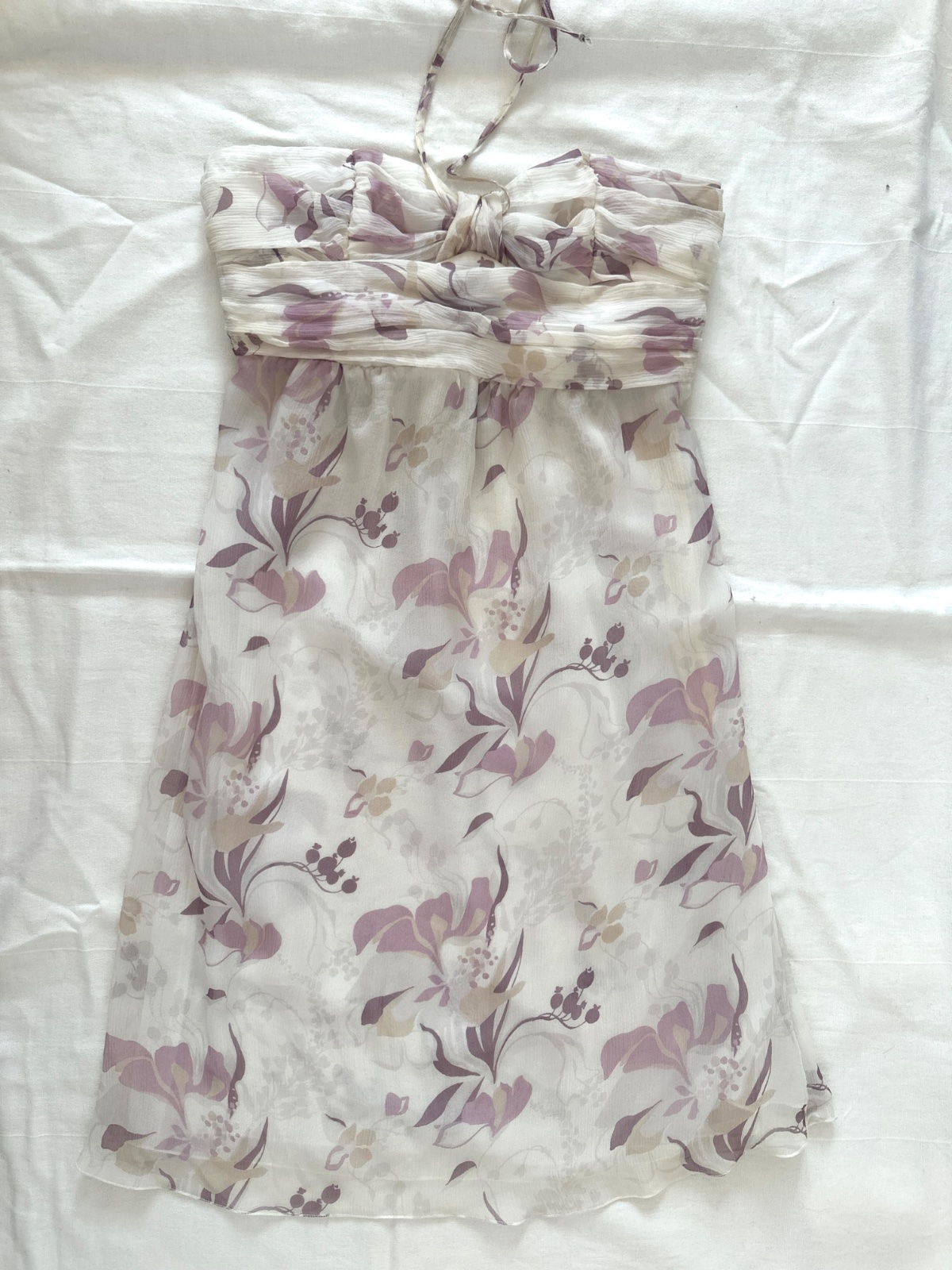 Tieto hodvábne šaty od talianskeho návrhára Flavia Castellaniho sú krásne ecru s bledoružovými kvetmi. Zapínajú sa na bočný zips. Vrch je vyrobený z nariaseného hodvábu s dodatočnou oporou (kosticami), takže nie je potrebná podprsenka. Šaty sa zaväzujú okolo krku a mierne sa rozširujú. Tieto krásne šaty sú ideálne na mnoho príležitostí. Veľkosť na etikete je talianska 42; všetky miery sú na fotografiách. Materiál je 100 % hodváb.