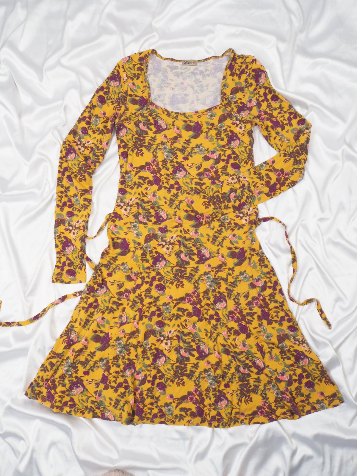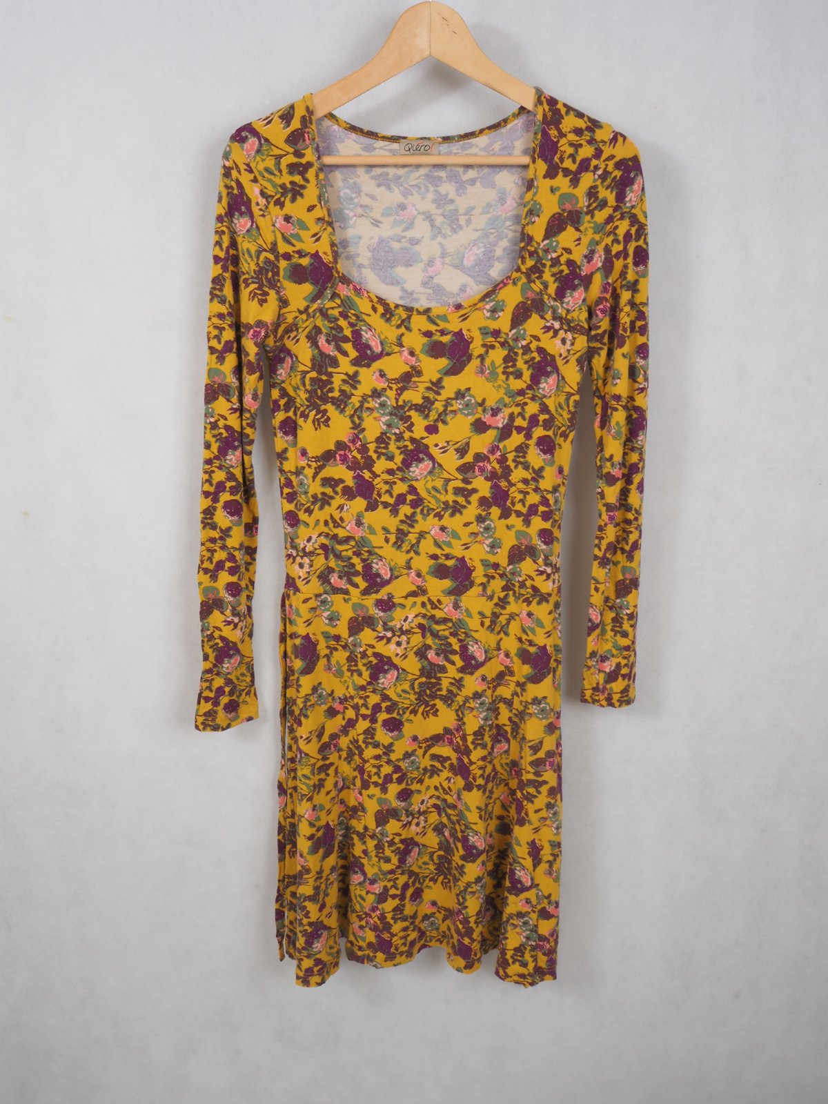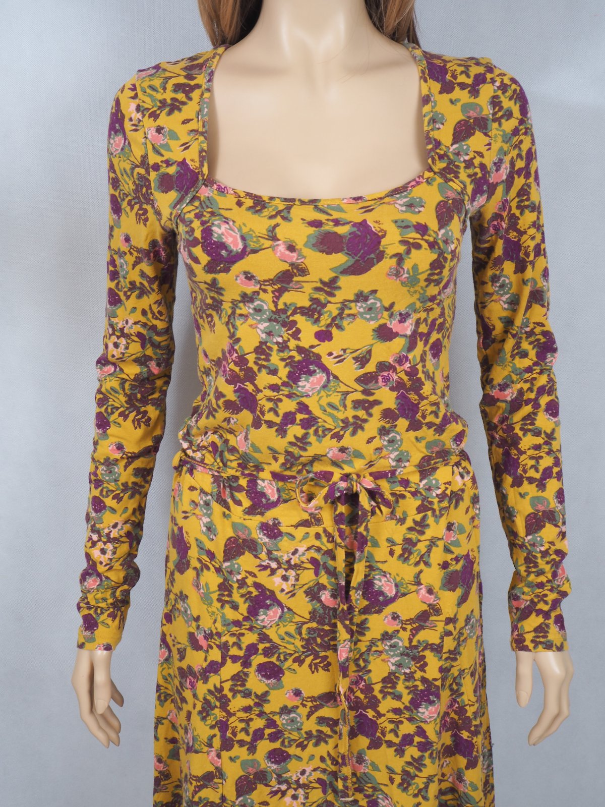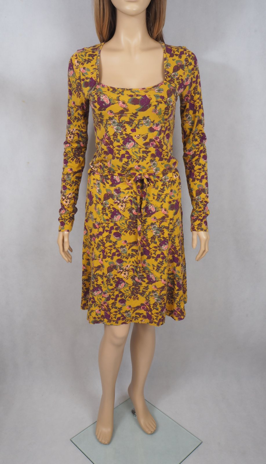Kvalitné úpletové šaty starožltej farby, s drobným vzorom, materiál 95% viskóza, 5% elastan, super stav.