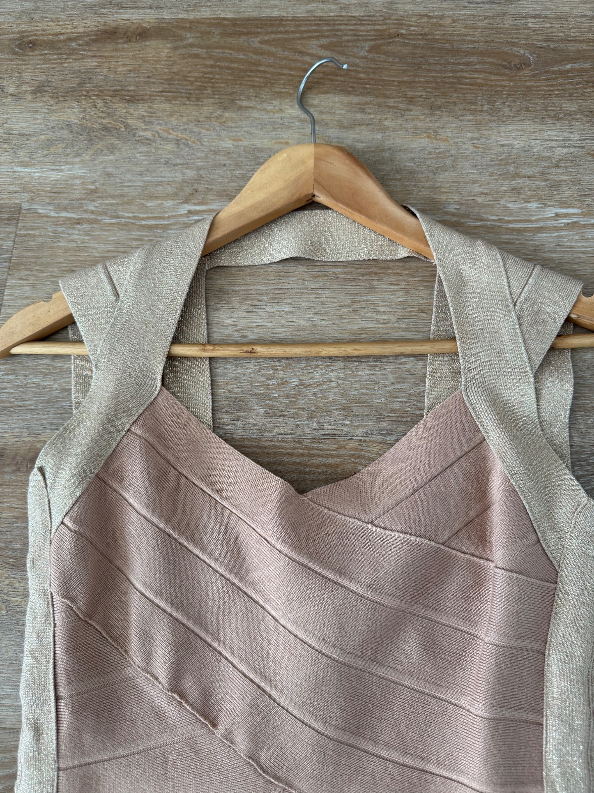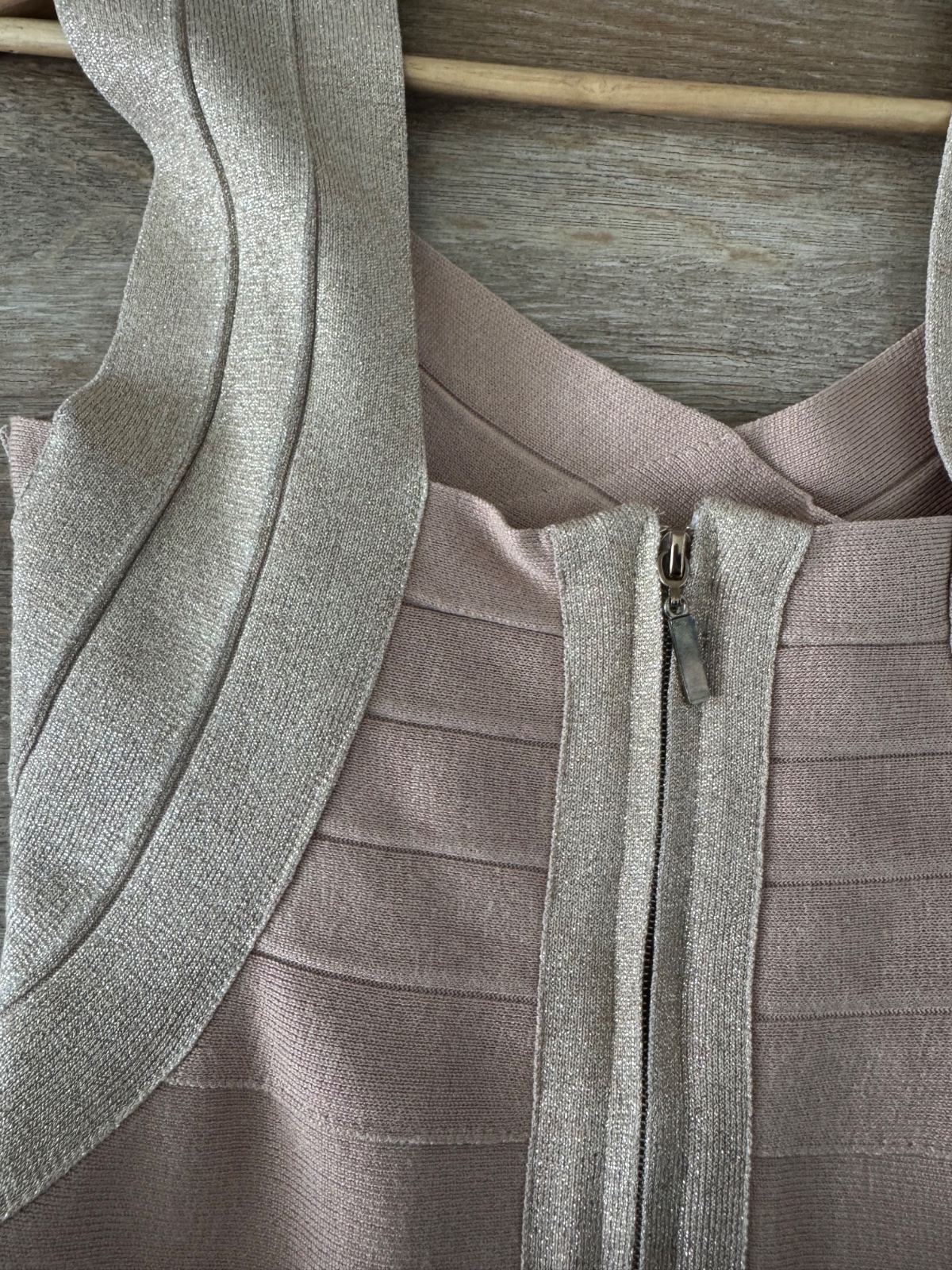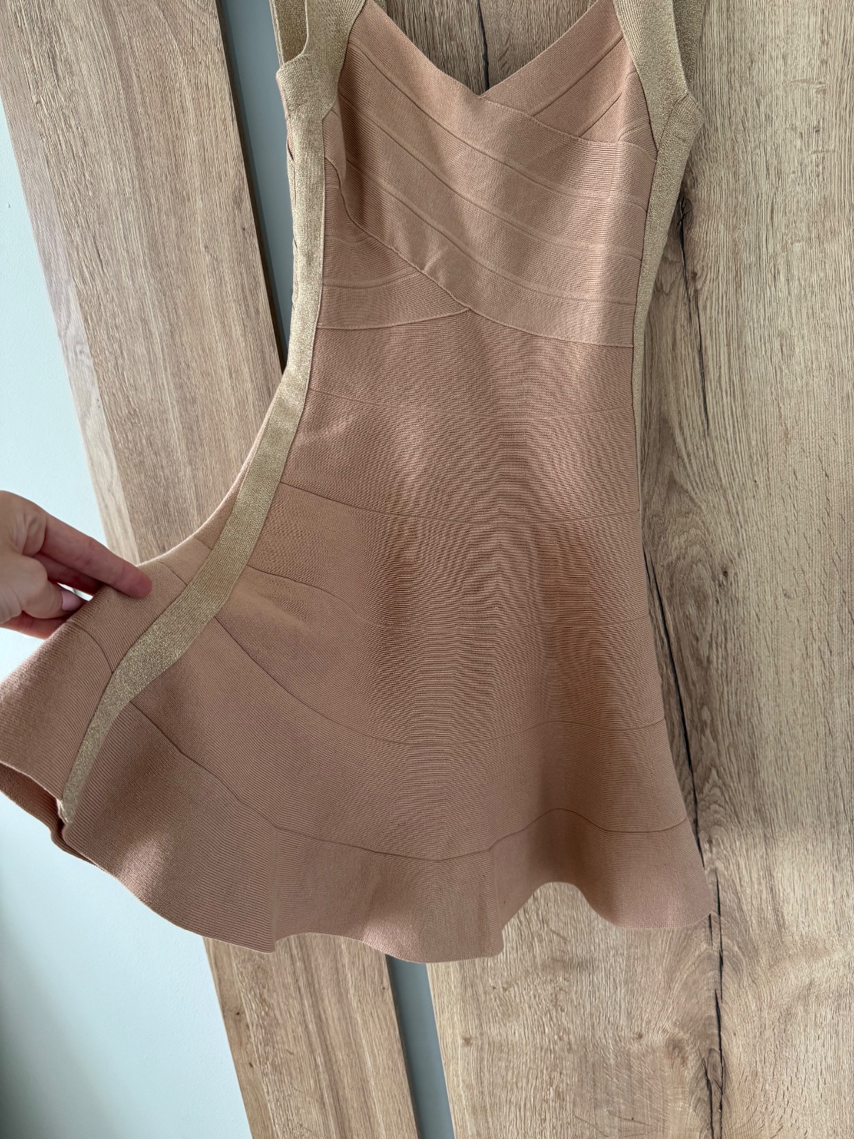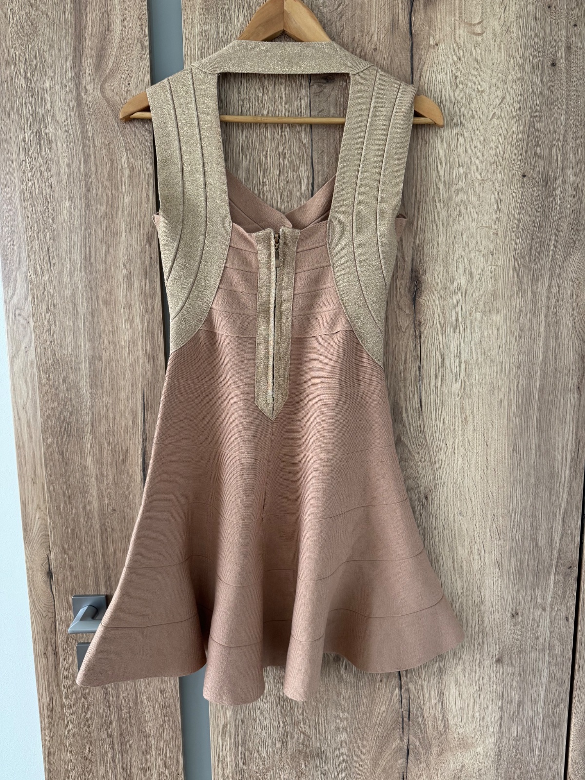 Ponúkam krásne bandážové šaty s výstrihom a s á-čkovou sukňou. Pekne sa prispôsobia, veľkosť ideál na S/M. Sú v takej púdrovej farbe v kombinácii so zlatou trblietavou farbou. Vhodné na bežné nosenie ale aj na nejakú akciu;) Boli pár x oblečené, naďalej vo veľmi peknom stave. Poštovné podľa taríf.