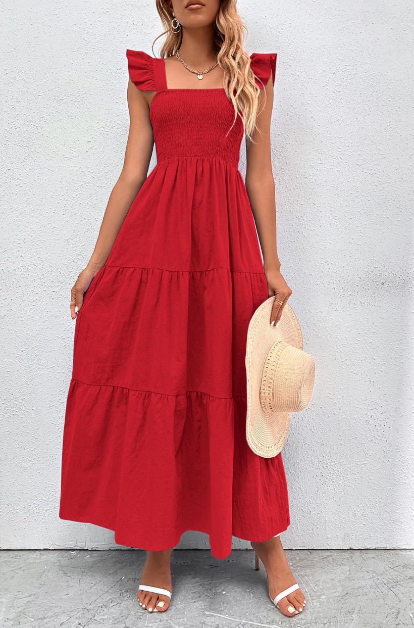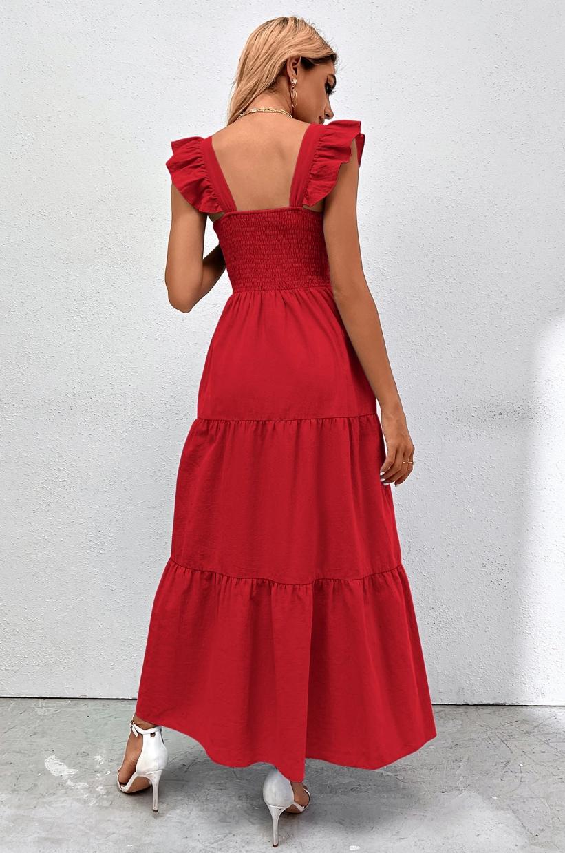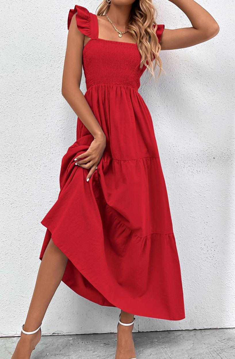 Bavlnené šaty v peknej červenej farbe, na ramienkach volánik, cez prsia nagumičkované, od pŕs voľné, sukňa v A-čkovom strihu. Nové, nenosené. Veľkosť M, ale sedí aj na S, dĺžka 128cm, prsia 2x36 až 2x52cm.