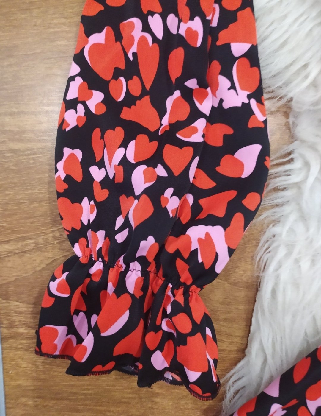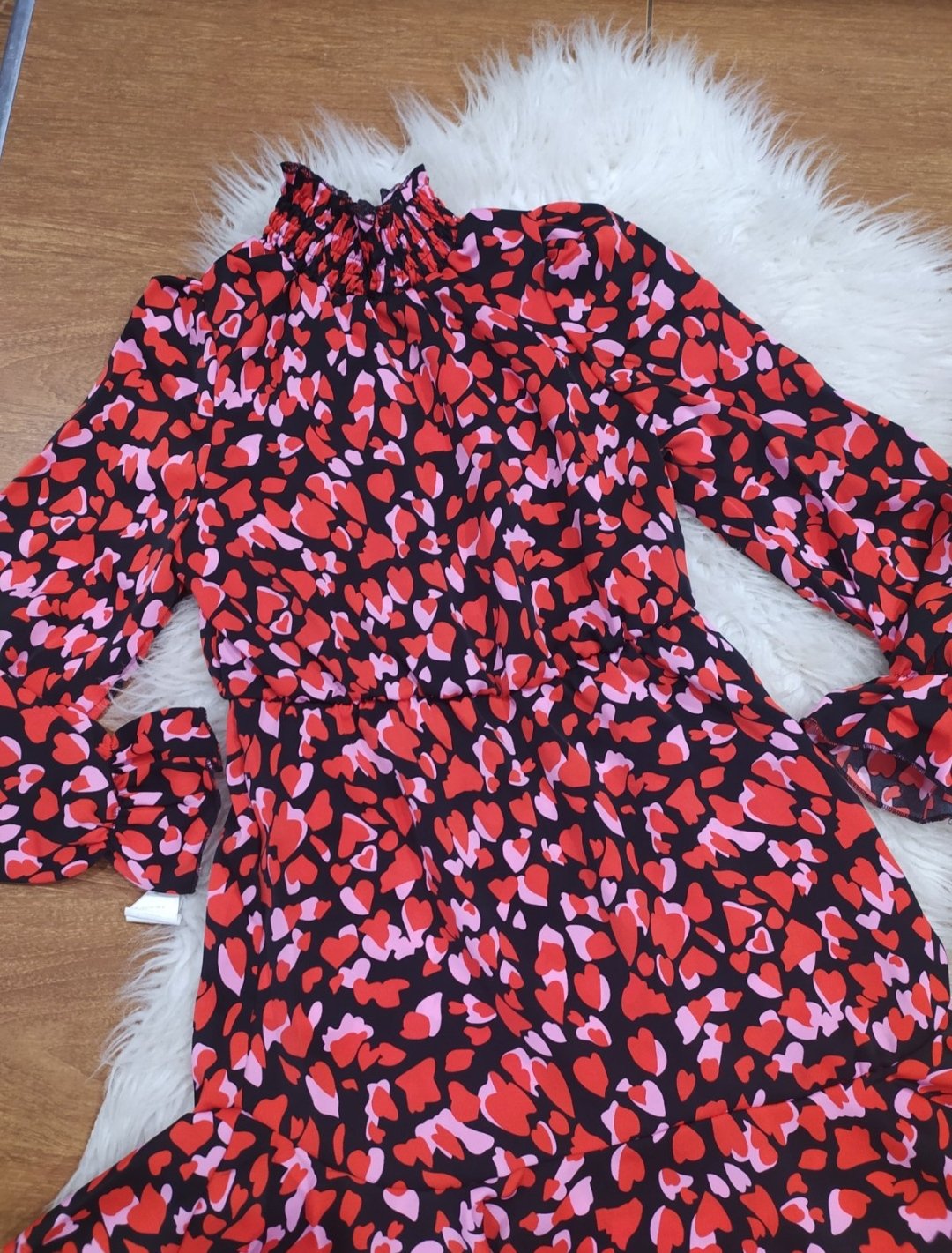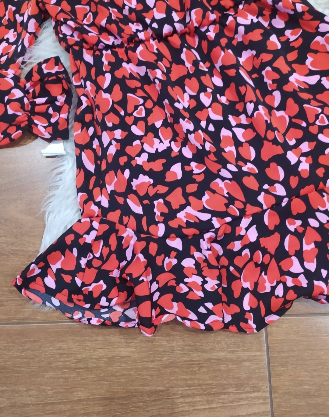 Krásne šatky so srdiečkovym vzorom.Satky sú v páse stiahnuté do gumy,sukňa ukončená volanikom.Vel sedíš na 128/134.