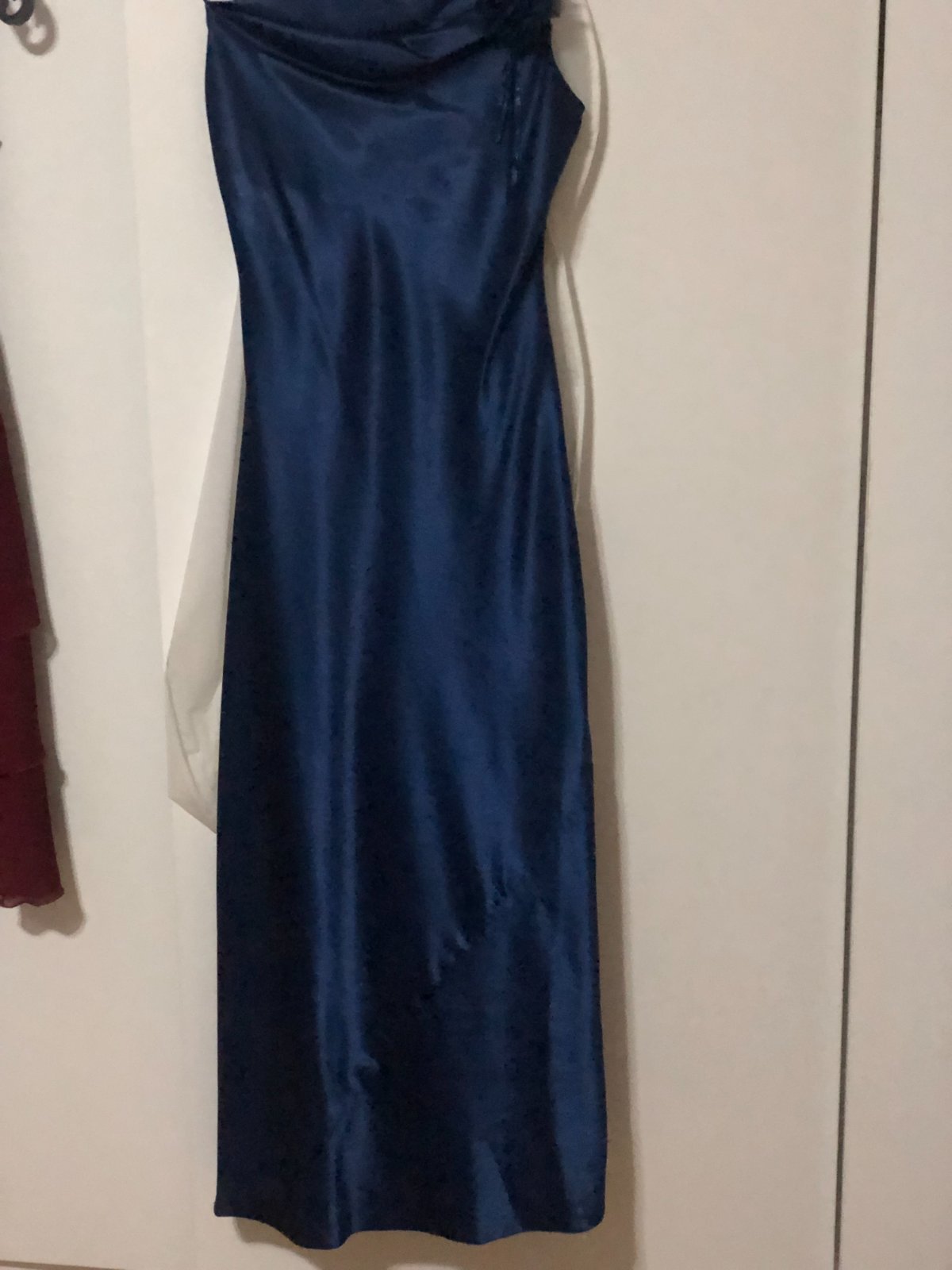 Spoločenské šaty, raz použité na venčeku, kráľovská modrá Na ramienka, vpredu rozparok, vzadu zips Boli zužované aj skracované Bez poškodení Kupované v butiku