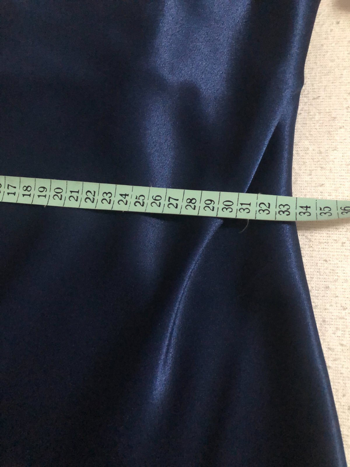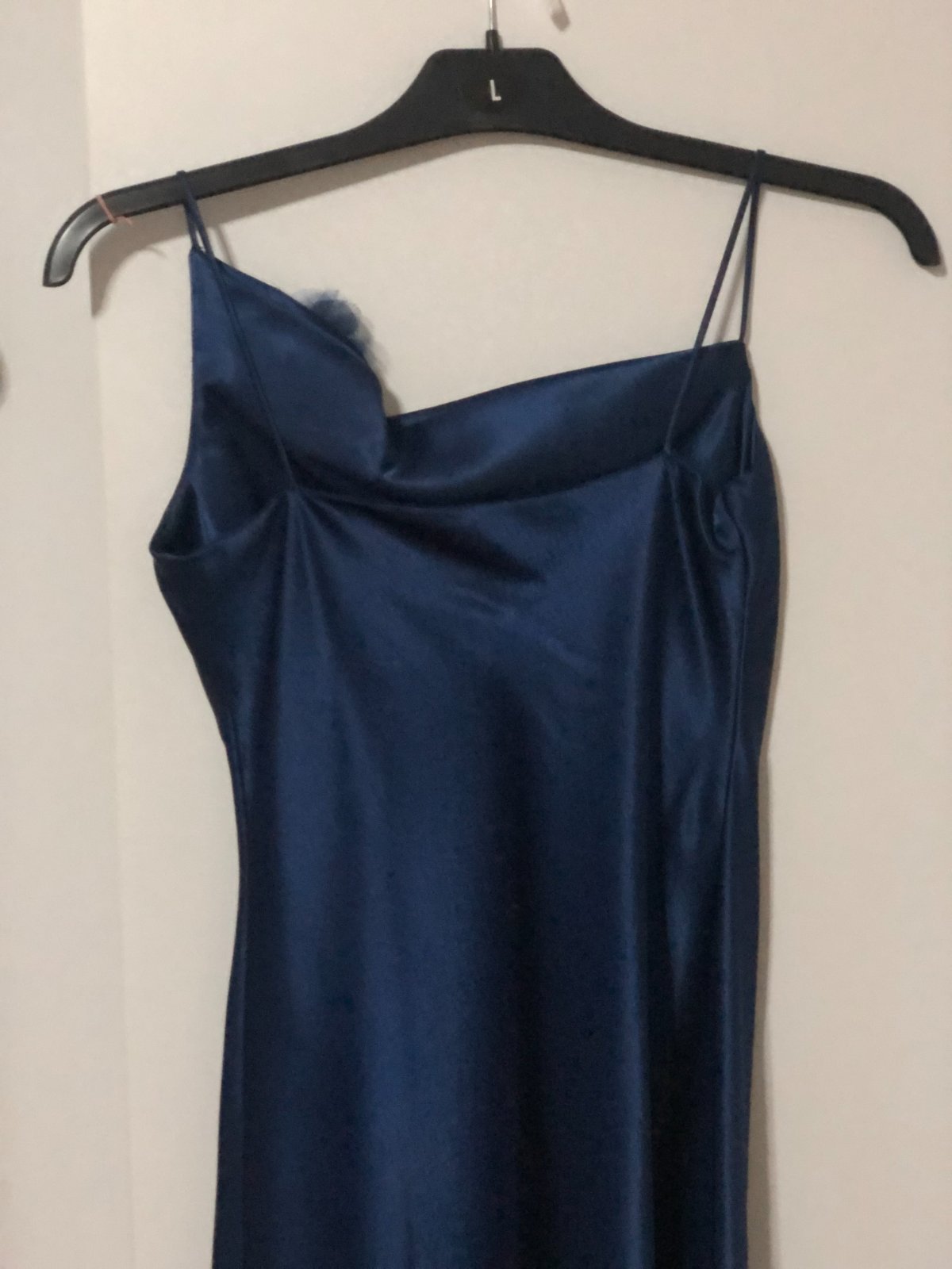 Úplne nové Zapínanie zboku na zip Krásna tmavomodrá farba Riasený top Nastaviteľná dĺžka ramienok Bohatá padavá sukňa