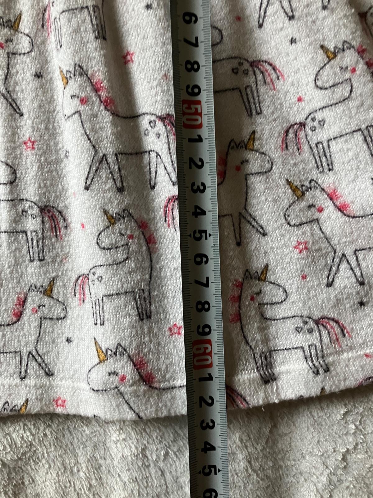 Elasticke saty s jednorozcami z prijemnej svetroviny zn. F&F, velkost 5-6, rozmery na foto. V pase guma. Jemne zmolky, inak bez poskodeni.