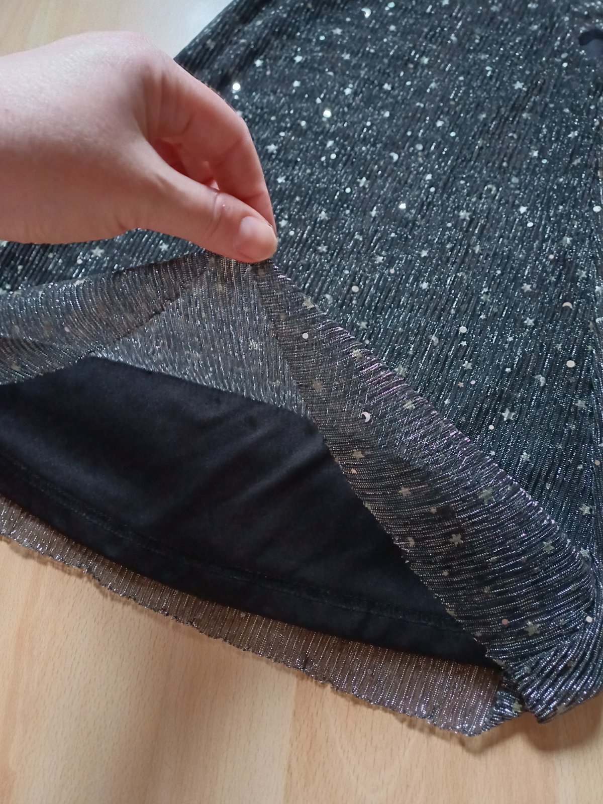 Podšité, navrchu niečo ako tyl s prilepenymi flitrovymi ozdobami - vela z nich pri prani odpadlo ale ostal na šatach zaklad, stale krasne to ukáže, aj mimo toho sú trblietavé, jednoduchy a pohodlny strih
