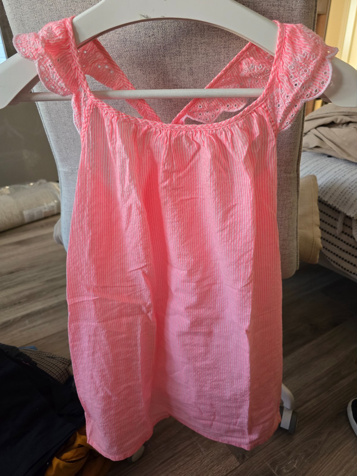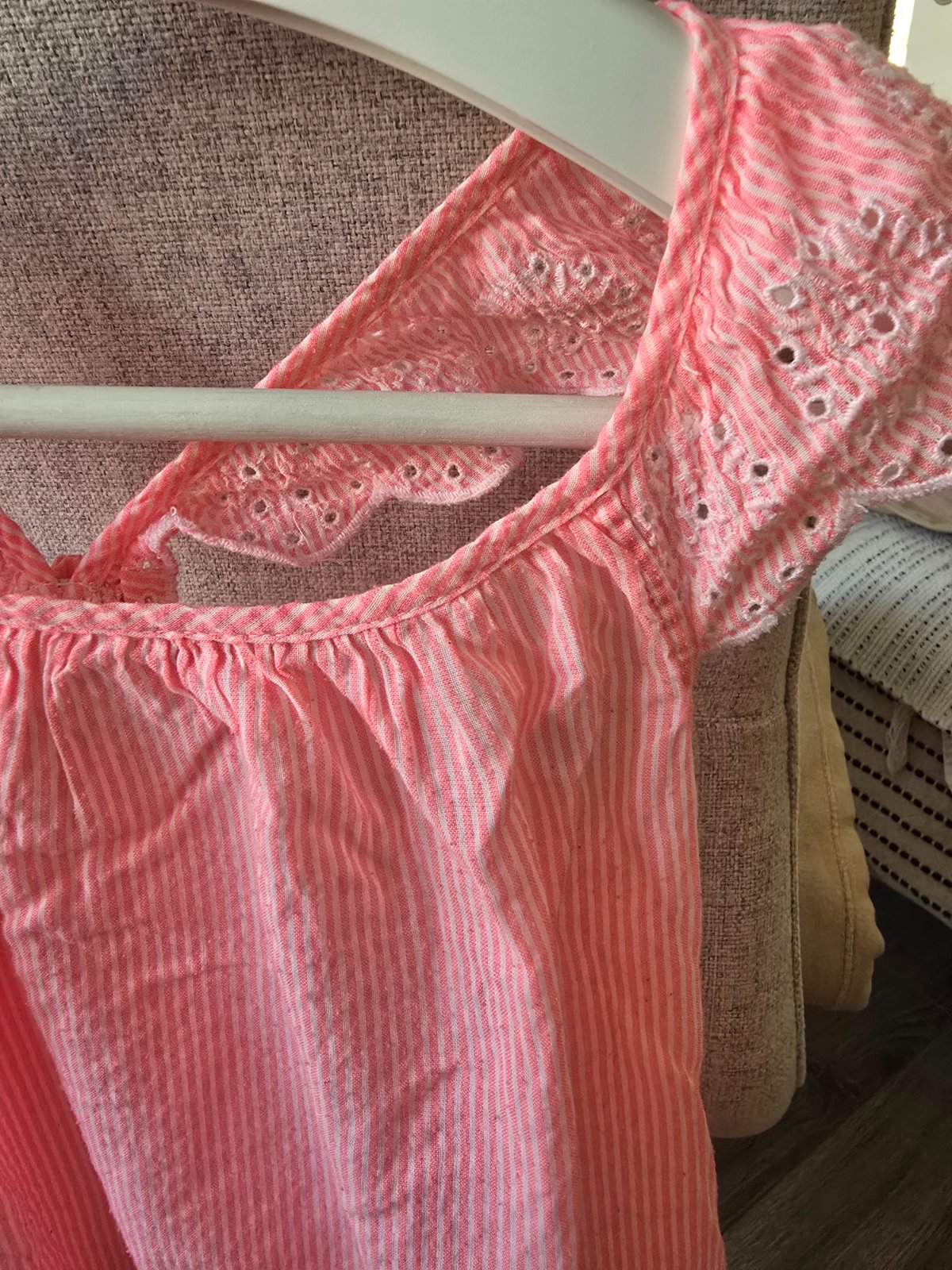 Extrémne lahulinké šatičky,vhodné do najväčších horúčav..ružové s neonkovo oranžovými guličkami,občas nevýrazná chybička ako zatiahnuté ci fliacik