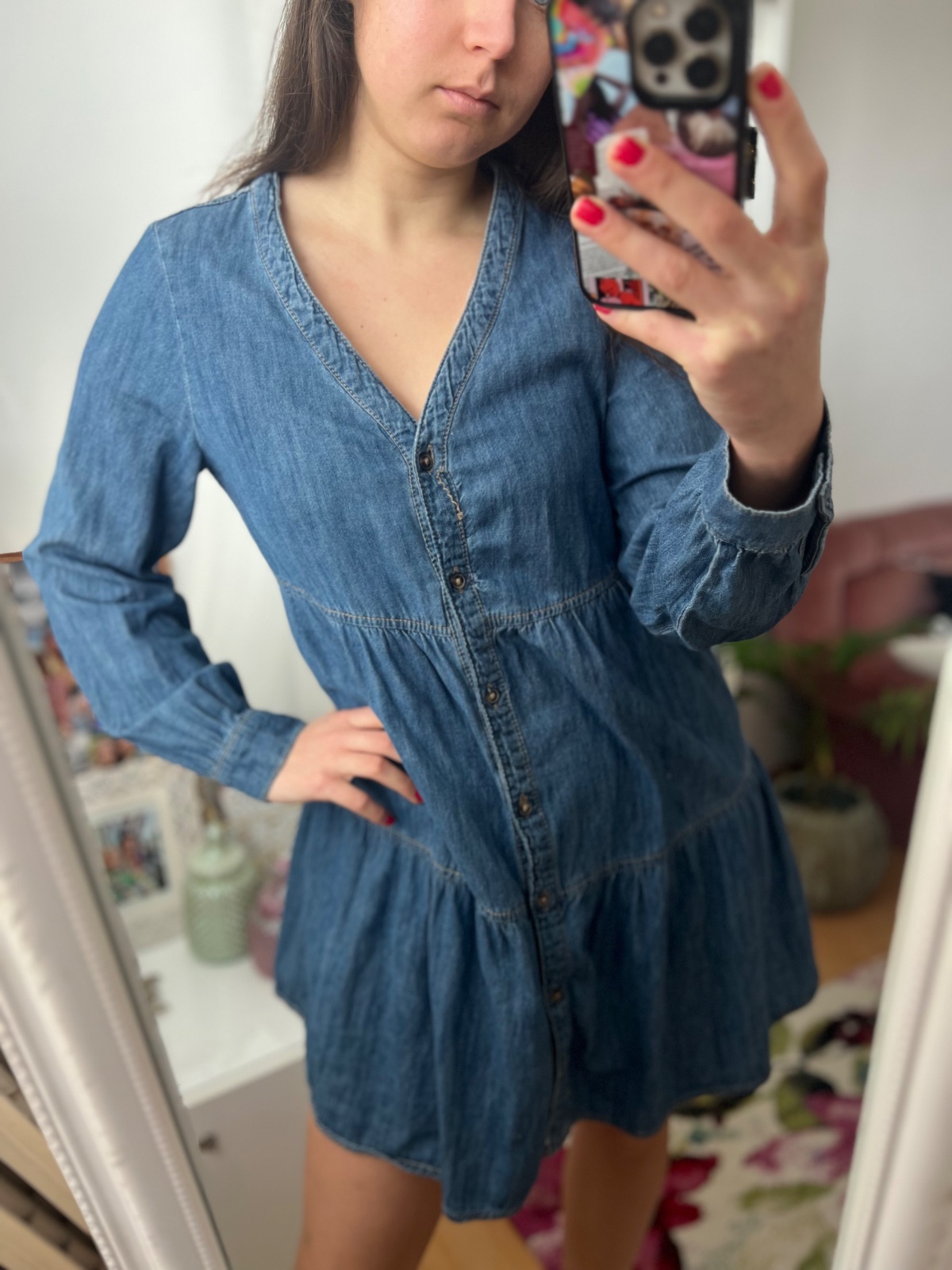 Stav ako na fotke, pri prvom hornom gombíku je vytiahnutá nitka.