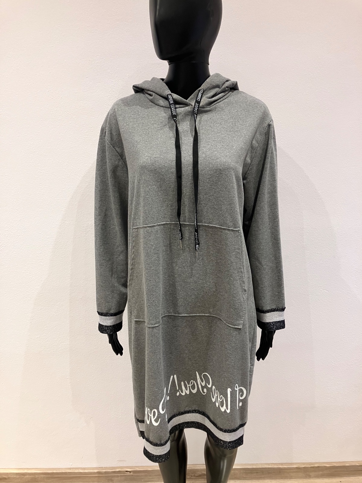 Dámske mikinové šaty s dlhým rukávom, kapucňou na zaväzovanie, s nápisom, na spodku s lesklým strieborno-čiernym lemom, elastické, klokanie vrecko, veľkosť cca XL, materiál 100%bavlna.