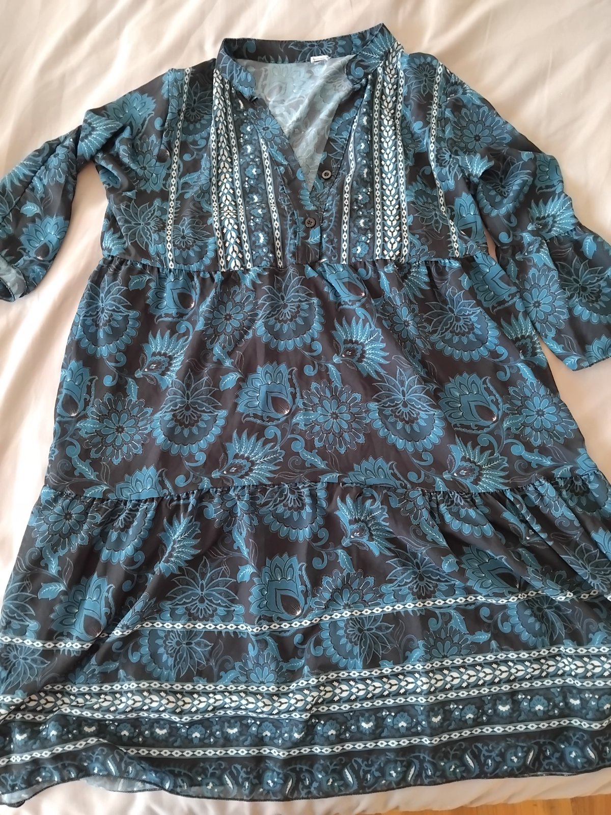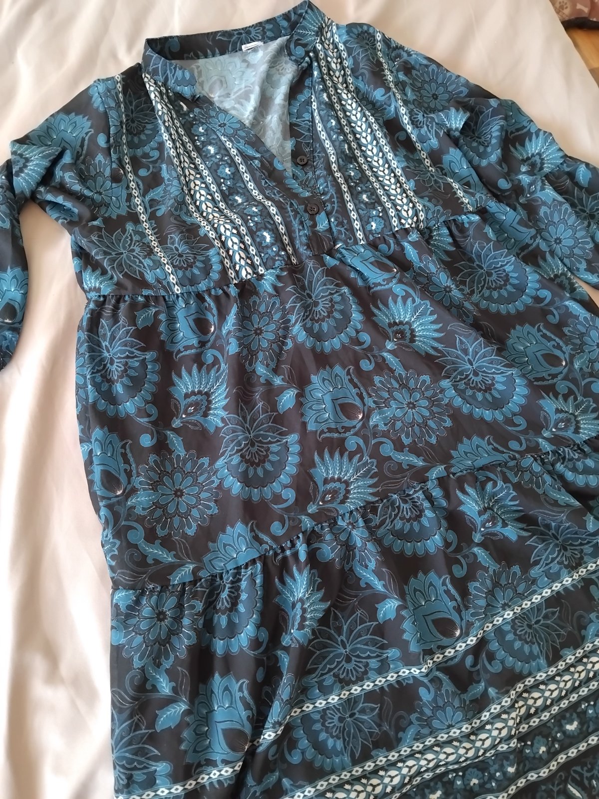 predám dámske košeľové šaty v dobrom nosenom stave, píšu veľkosť 42, značka Esmara, 100% lyocell, voľný strih, ¾ rukávy, dve bočné vrecká, rukávy sú na uväzovanie, dĺžka od pleca 90 cm, šírka v po...