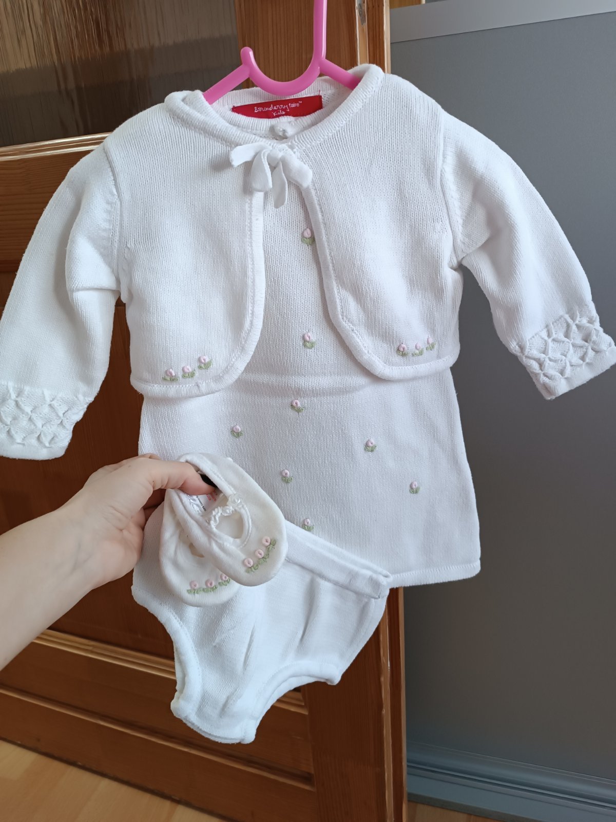 Ako nové-teplejšie , píšu 100 % bavlna, veľkosť 68, celková dĺžka od pleca cca 36-37 cm, sukienka je balónoveho strihu, zvnútra teplé ako mikinka. Použili sme ich len na fotenie . Cena 2 EURO+pošt...