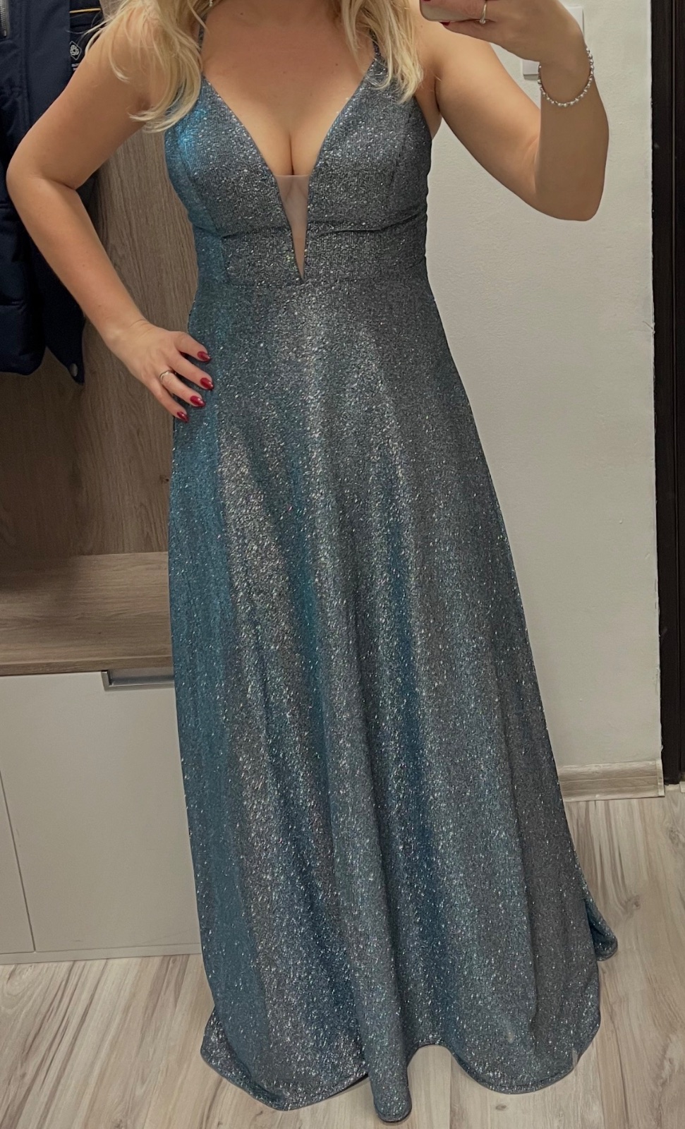 Nádherné tyrkysové šaty so zapínaním okolo krku a posiate korálkami. Raz oblečené, ako nové. ZNAČKA: DELARU