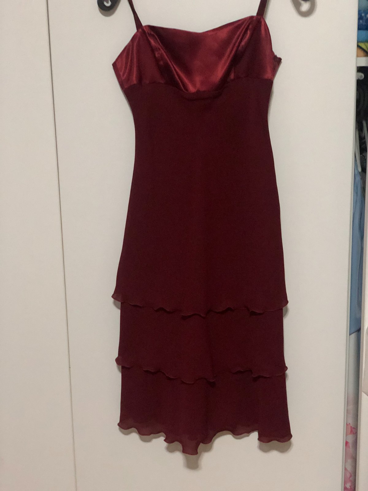 krásne vínové kokteilové šaty, na ramienka, ktoré sa dajú odobrať, s opaskom, píše veľkosť 38, ale podľa mňa sú určite menšie, ja nosím tak 34-36, mala som ich len raz oblečené, sú v tom stave.