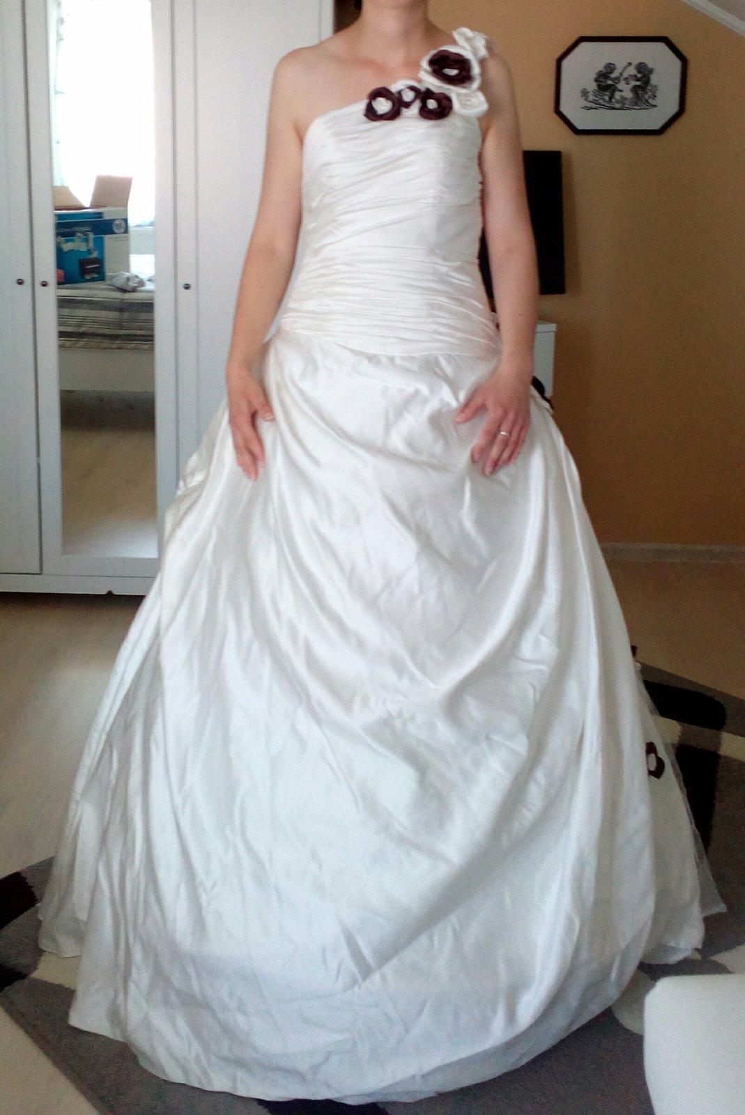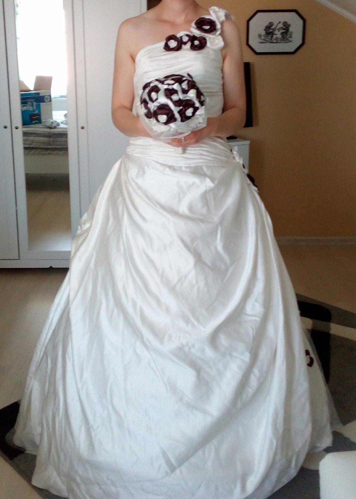 svadobne saty, farba je biela s hnedymi kvetmi. Velkost 40-42 na vysku cca 175 cm.
