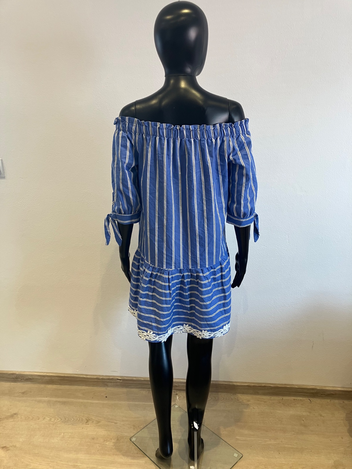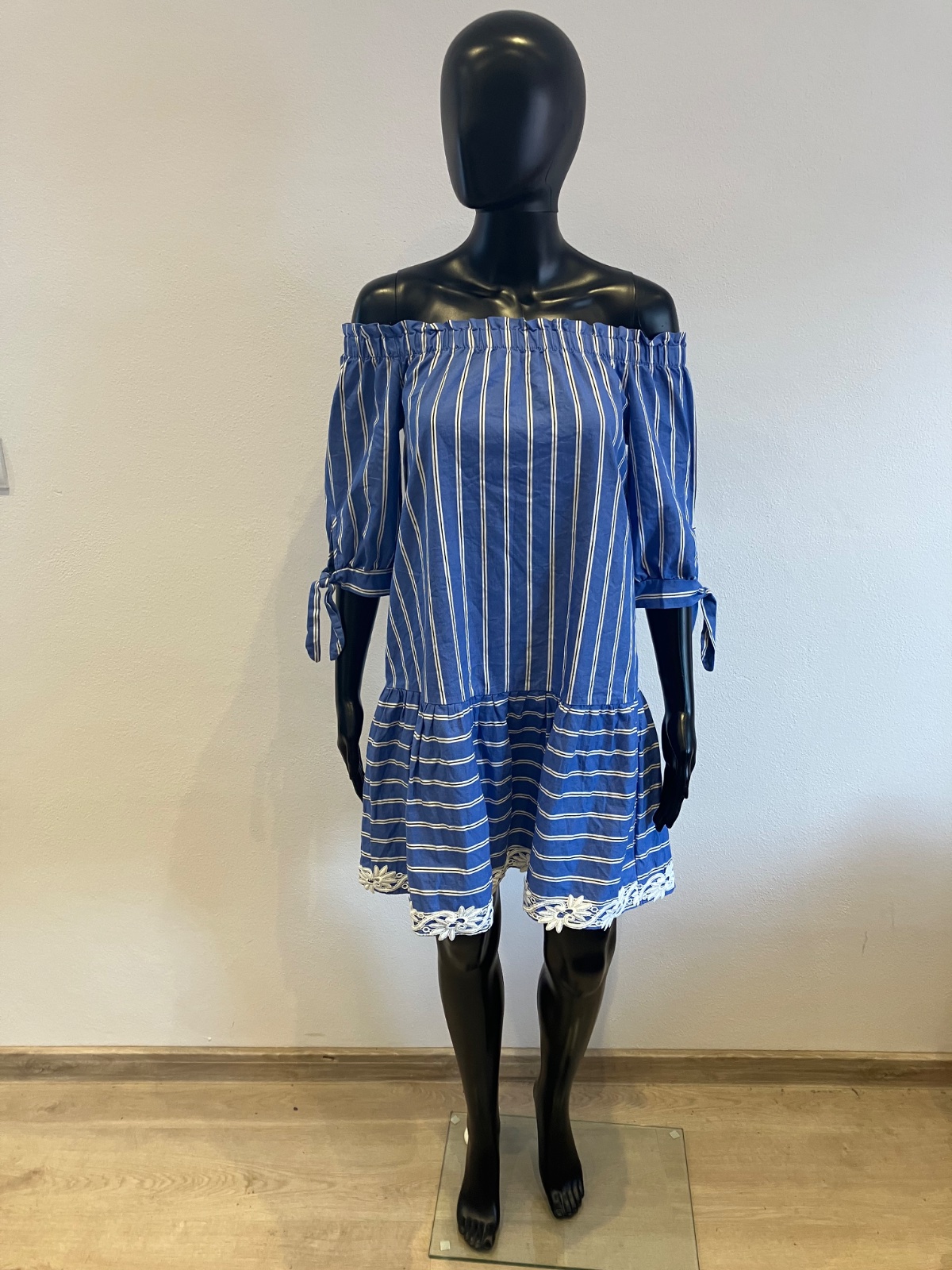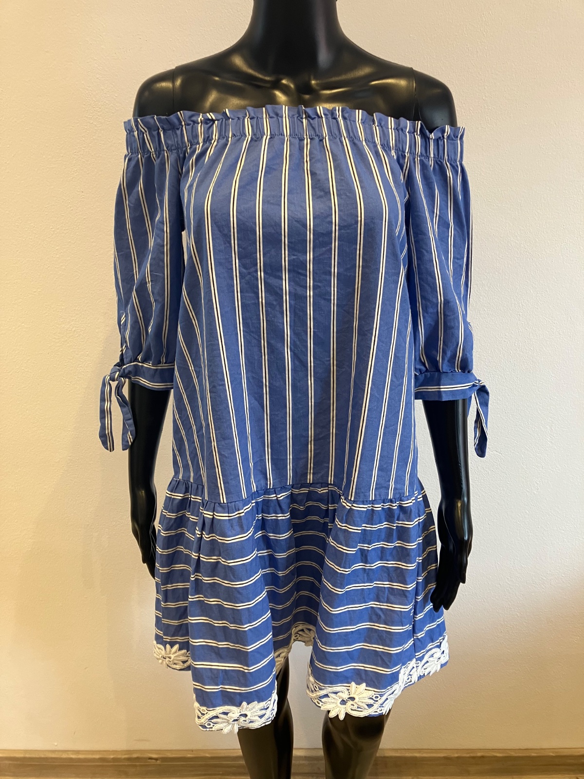 Dámske košeľové šaty s krátkym rukávom, volánom a krajkou na spodku, s odhalenými ramenami, jemne elastické, farba modro bielo čierna,
